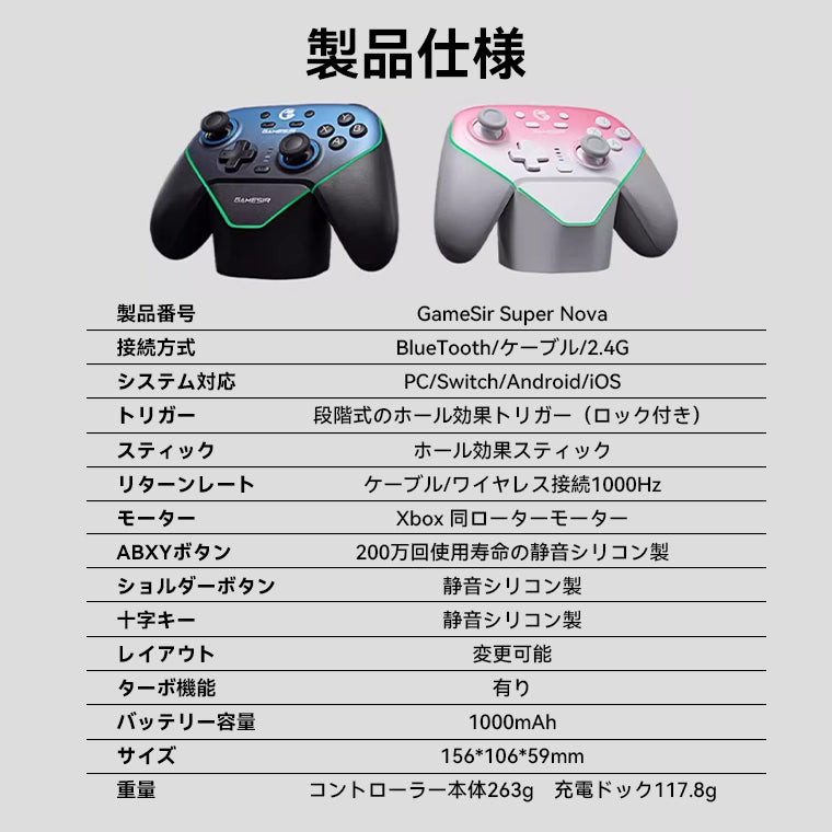 【充電ドック付】 GameSir Super Nova コントローラー ワイヤレス プロコン PCコントローラー Switch / PC / Steam / IOS / Android 全対応 ホール効果ジョイスティック ホール効果トリガー スリーモード接続 リニアトリガー 1000Hz 充電ドック スタンド 二色選択可能