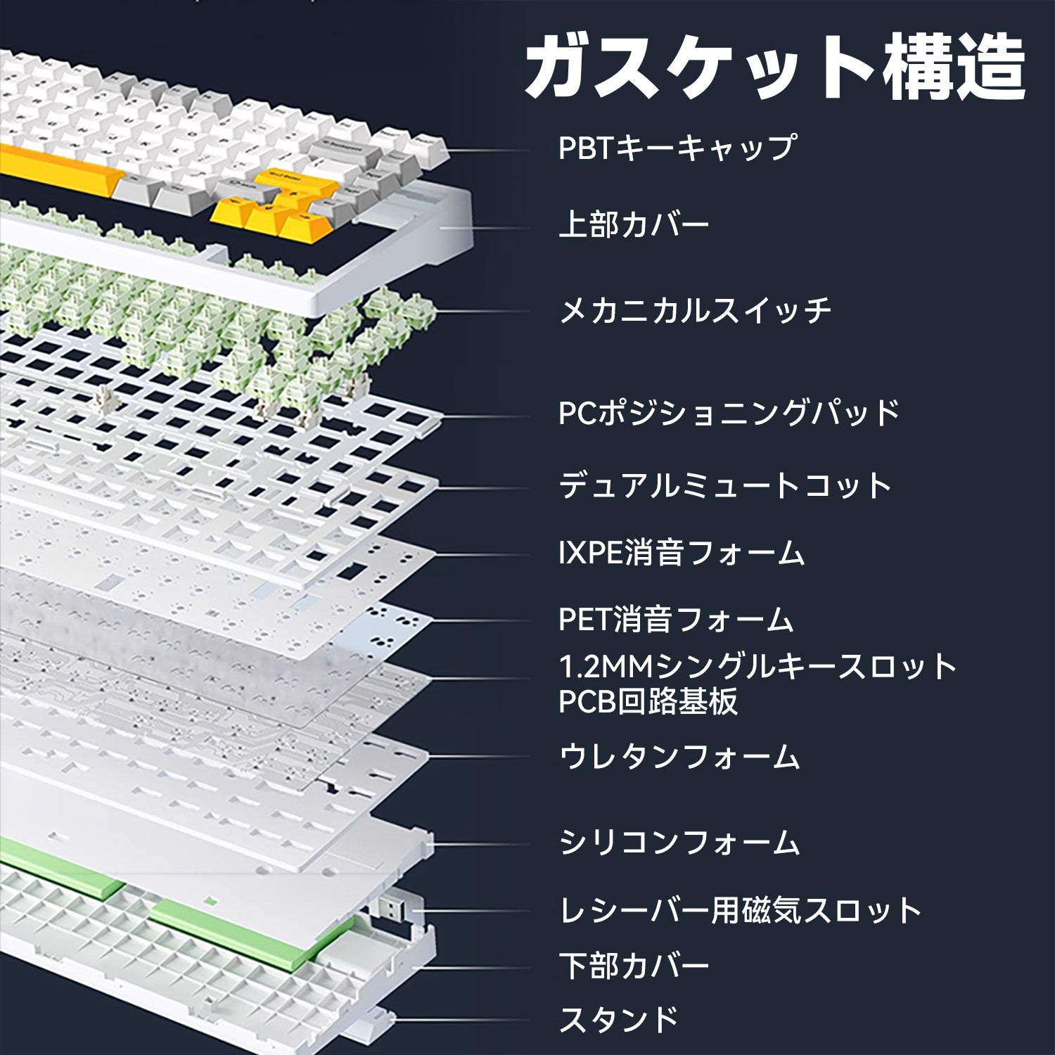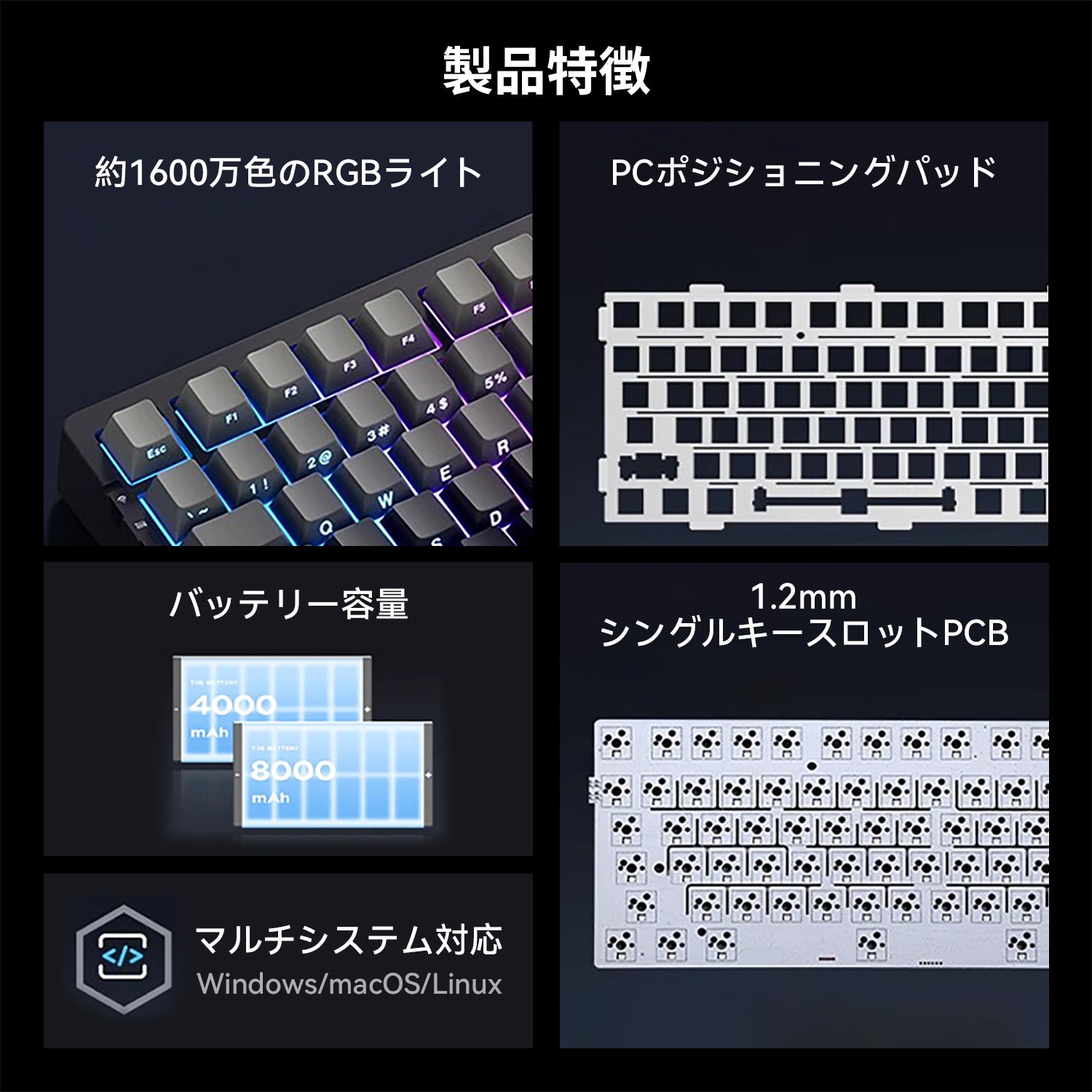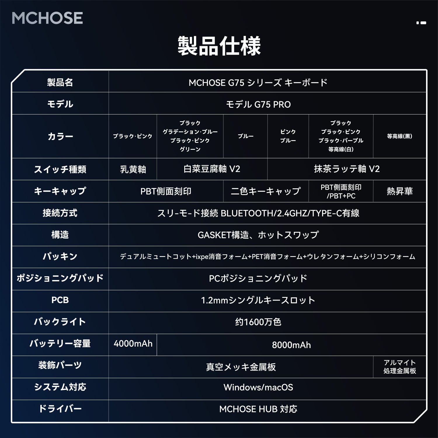 【送料無料】MCHOSE G75 PRO ゲーミングキーボード メカニカルキーボード 82キー 無衝突コンパクト Bluetooth5.0/2.4Ghz/Type-Cケーブル ホットスワップ EVA吸音PCB RGBバックライト 白菜豆腐軸 抹茶ラッテ軸 充電式バッテリー 8000mAh
