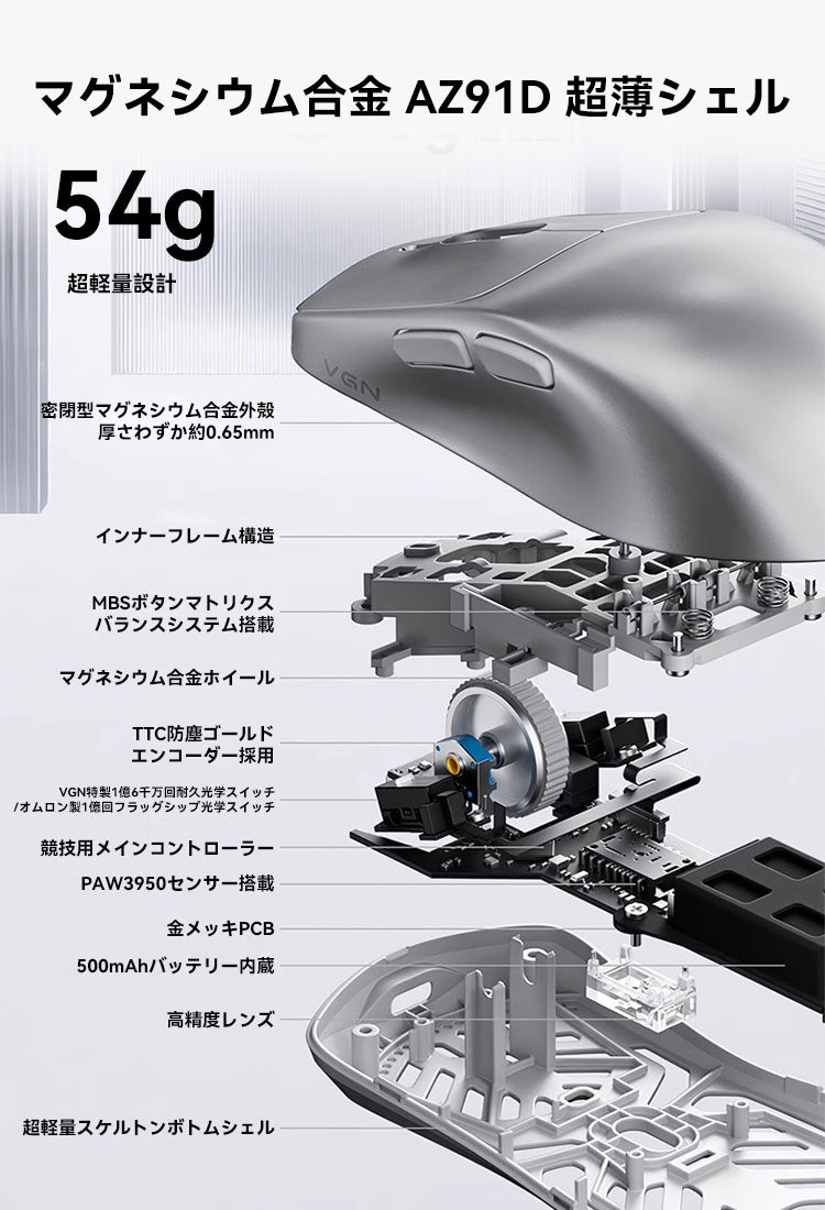 【送料無料】VGN DRAGONFLY King ゲーミングマウス ワイヤレス 無線 超軽量 54グラム PAW3950 2.4Ghz/USB-C接続 バッテリー 2色選択可能 超軽量 マグネシウム合金シェル 42000DPI 0.125ms超低遅延 特殊技術採用 高精度プロ仕様