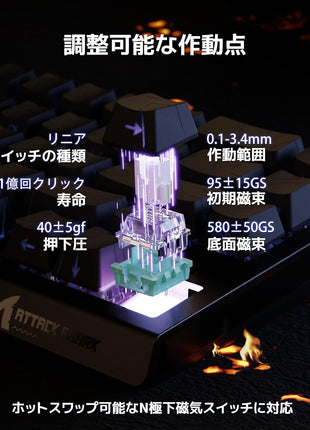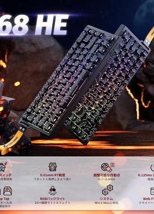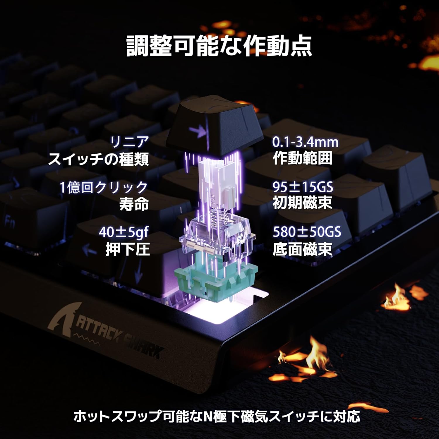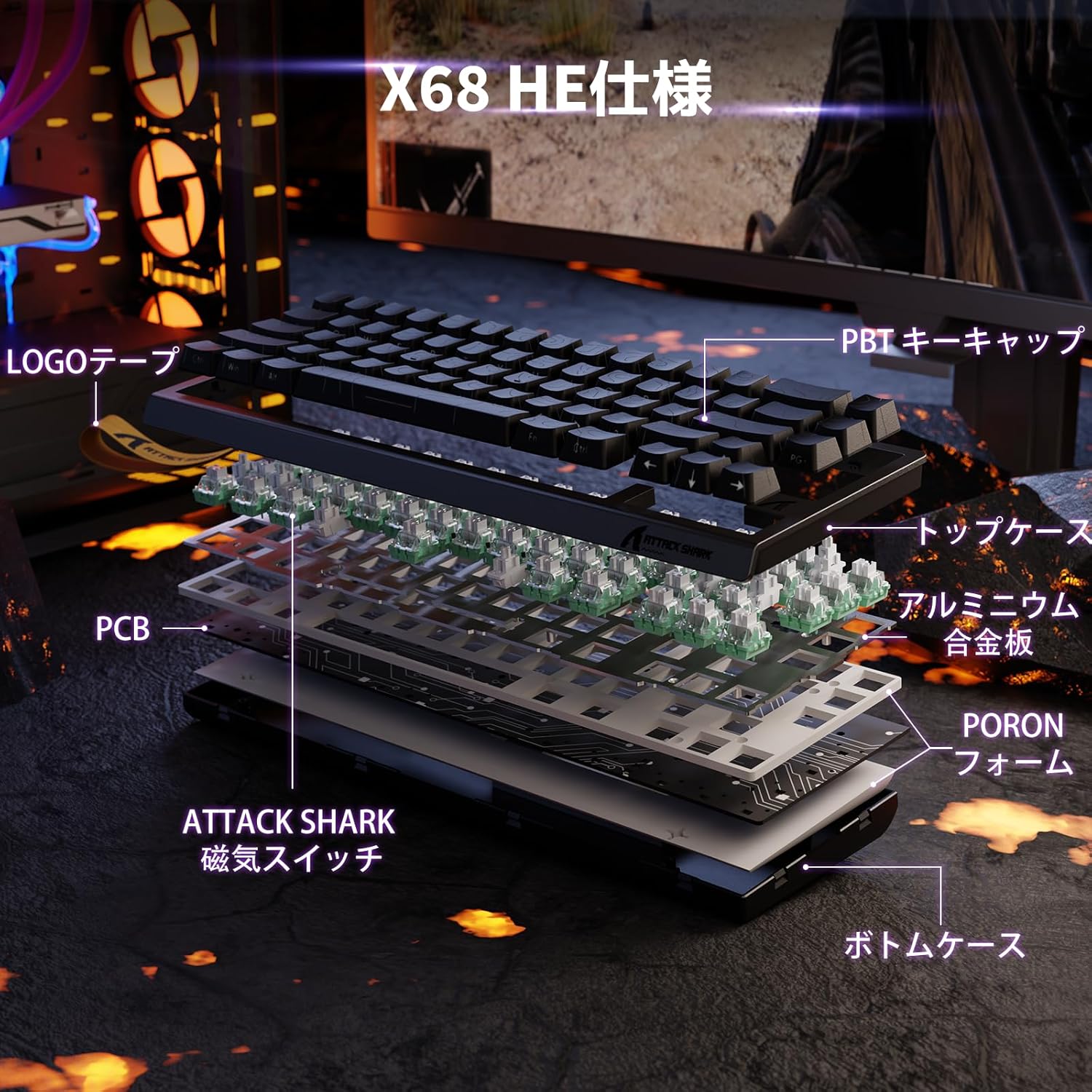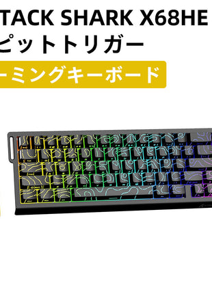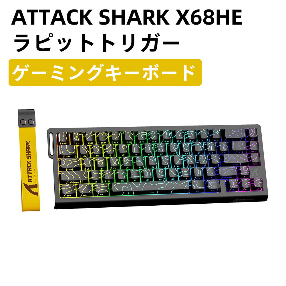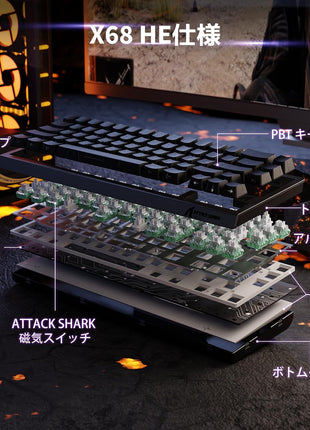 ・ATTACK SHARK X68HEは、ラピッドトリガー機能を搭載したホールエフェクトキーボードで、アクチュエーションポイントは最大0.01mmまで調整可能です。65%サイズの68キーを備え、打鍵音が心地よいMagnetic platinumスイッチを採用しています。FPSや音楽ゲームに最適で、繊細で素早いプレイが可能です。 |