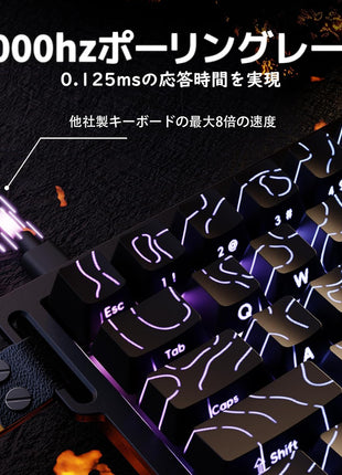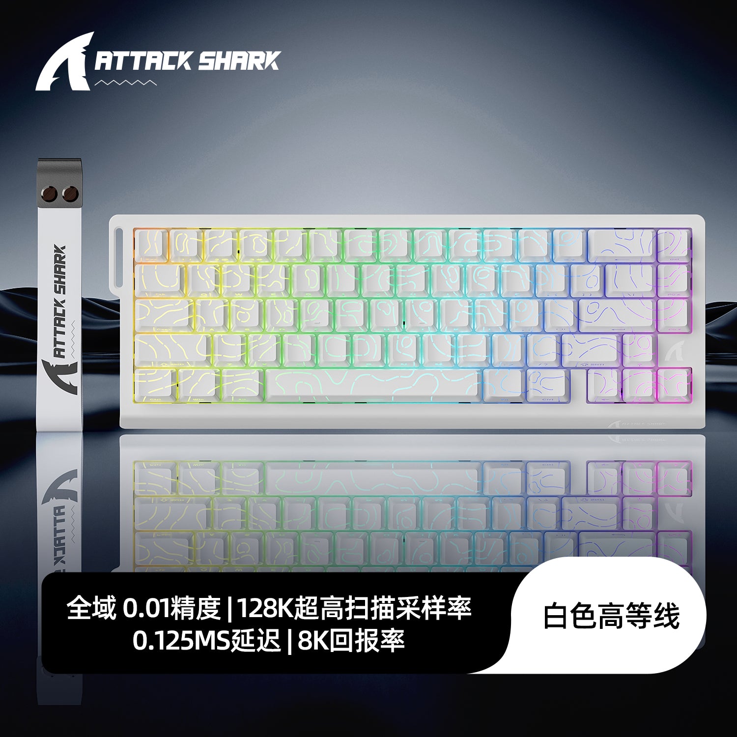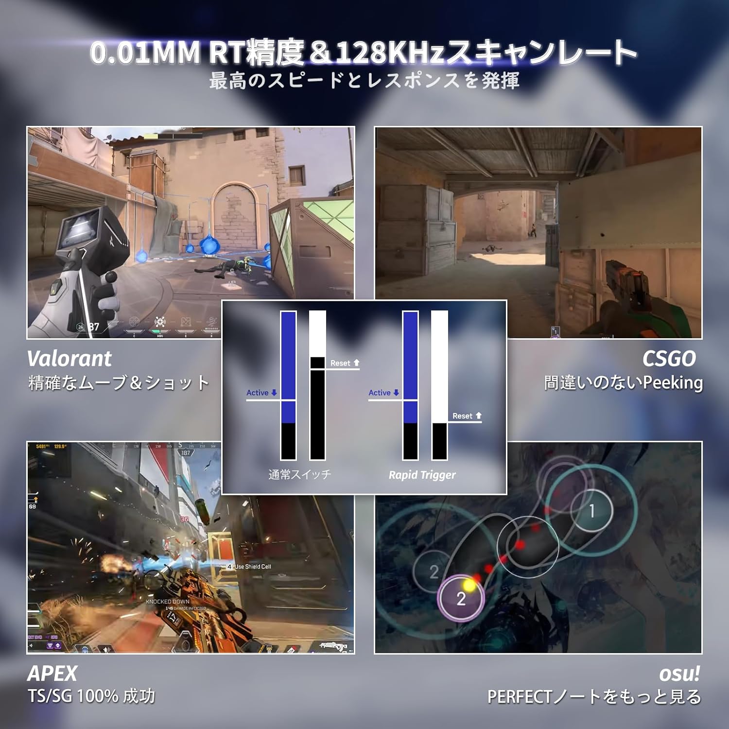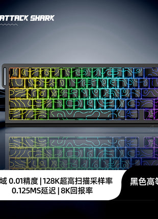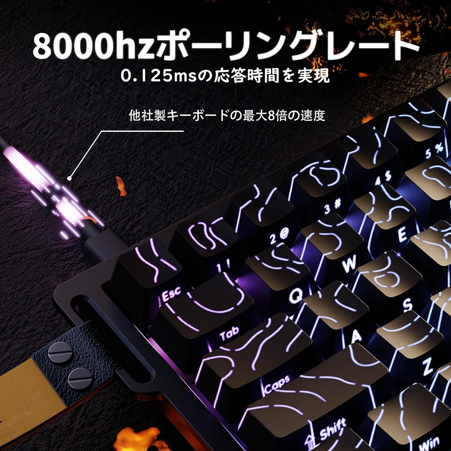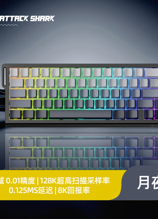 ・ATTACK SHARK X68HEは、ラピッドトリガー機能を搭載したホールエフェクトキーボードで、アクチュエーションポイントは最大0.01mmまで調整可能です。65%サイズの68キーを備え、打鍵音が心地よいMagnetic platinumスイッチを採用しています。FPSや音楽ゲームに最適で、繊細で素早いプレイが可能です。 |