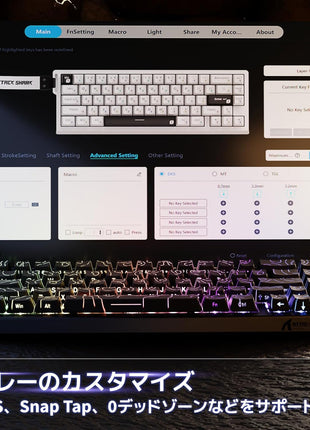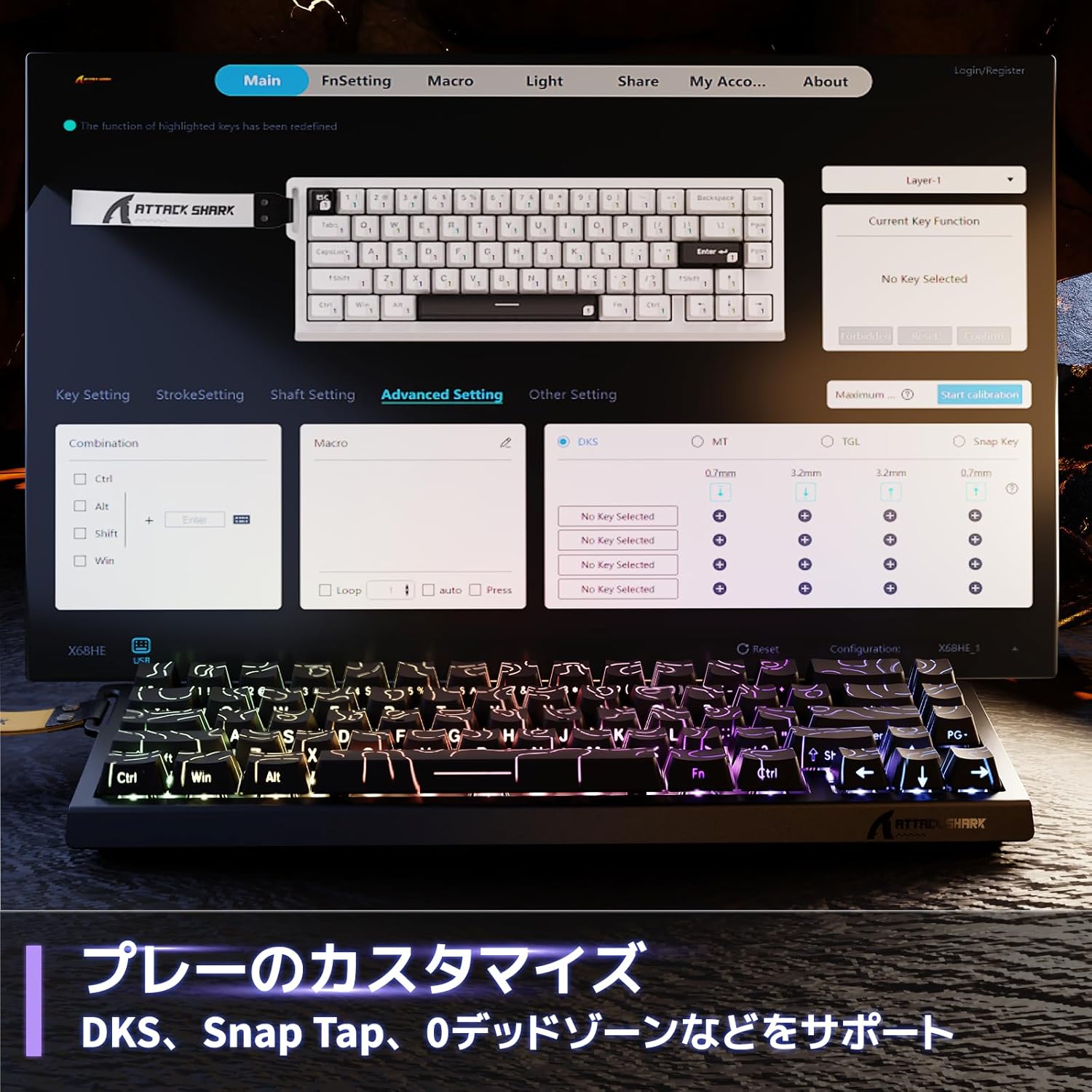 ・X68HEは、ソフトウェアのダウンロードなしで使用可能で、ウェブページから当社のキーボードモデルを認識します。RGBライト効果を調整したり、ケースをカスタマイズすることができ、さらに軸体の精度調整や、DKS、スナップキーなどの高度な機能を利用することができます。 |
