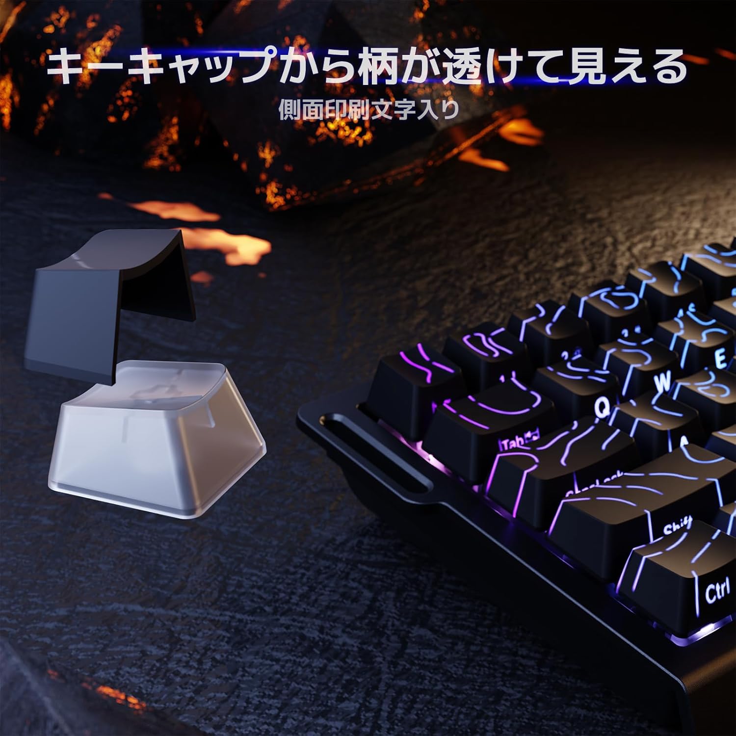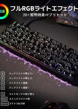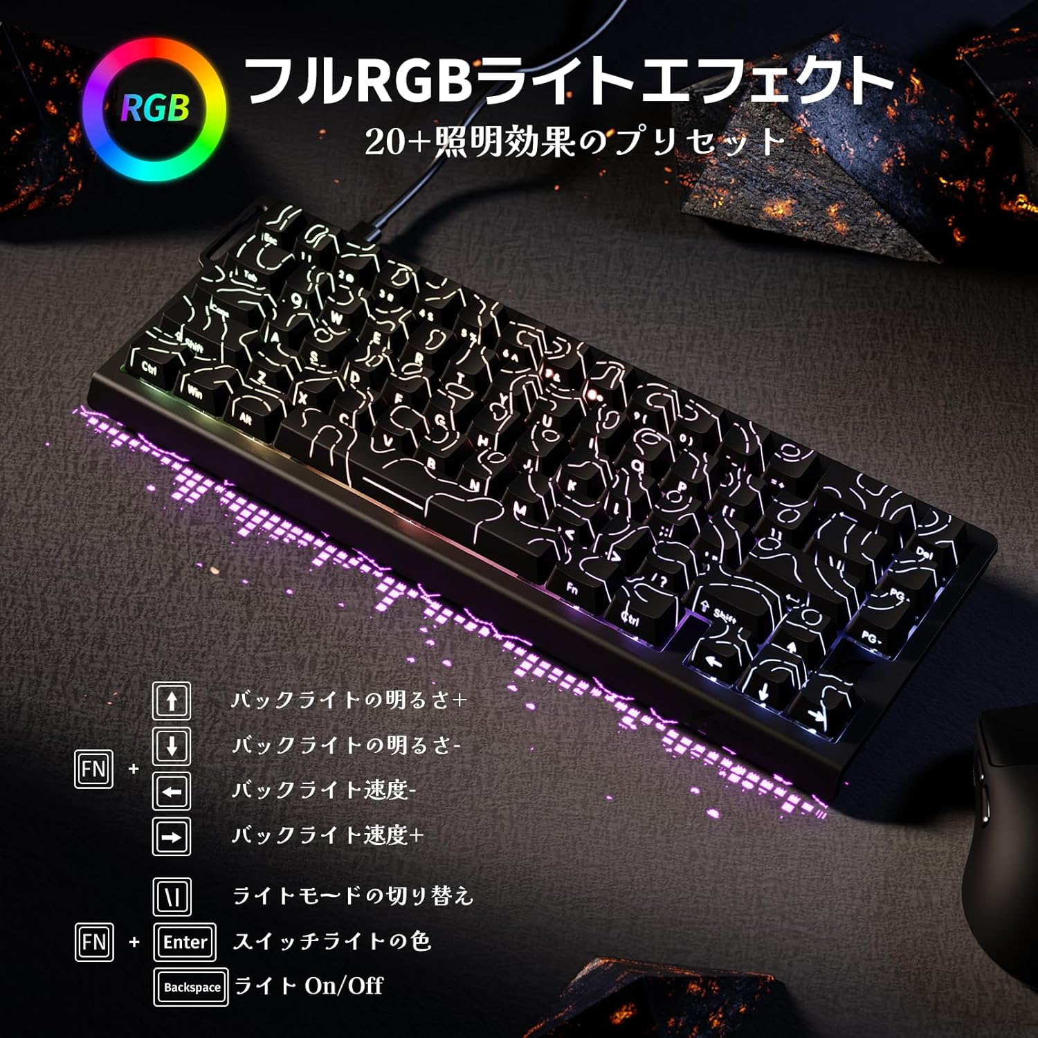 ・X68HEは、ダブルショットPBTキーキャップを採用しており、耐久性と質感を重視しています。21種類のRGB照明モードを搭載し、ライトバーとダイナミックなRGBライティング効果を備えています。光のパターンや色を簡単にカスタマイズでき、あなたの好みに合わせた簡単にカスタマイズ。 |