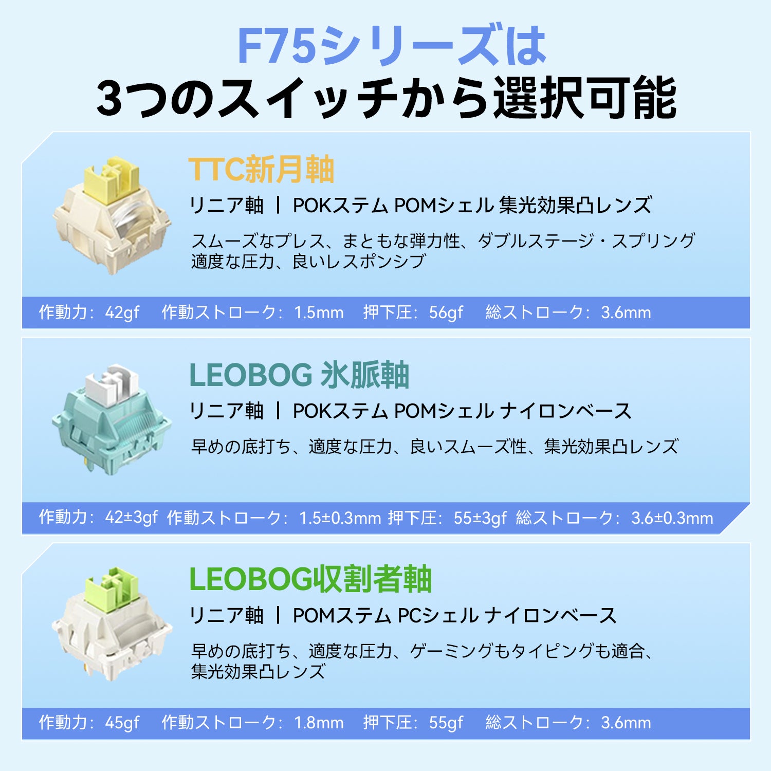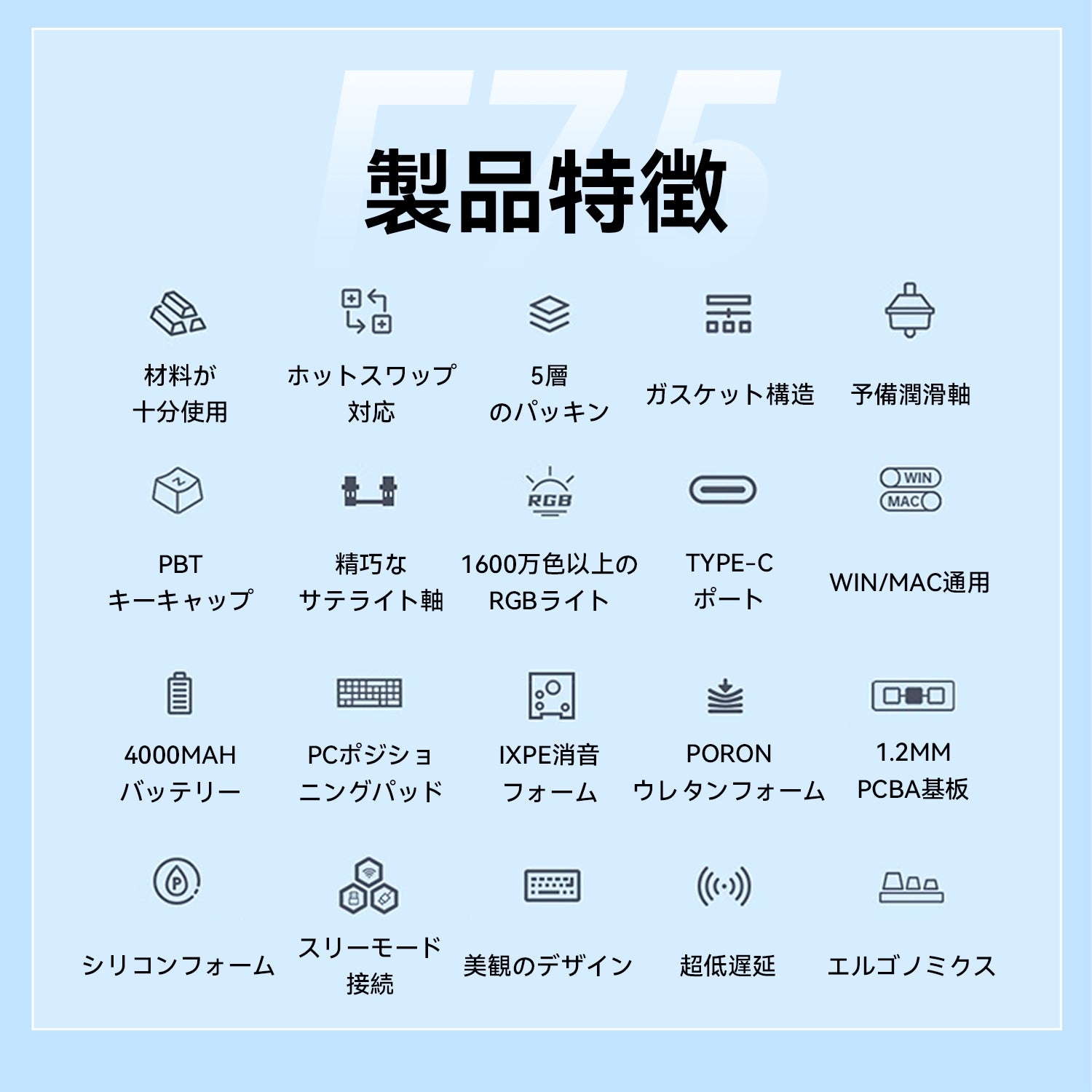 ・Bluetooth/ワイヤレス2.4G/cタイプ有線3モード切替をサポートし、複数のデバイスと互換性があります。ノイズの少ないワイヤレス設定でも、安定した有線接続でも、このキーボードはあらゆる状況に対応します。F75には、長時間の使用に耐える4000mAhの大容量バッテリーが付属しています。この大容量バッテリーにより、長時間の作業や激しいマラソンゲームでも、キーボードは常に最高のコンディションで使用できます。 |