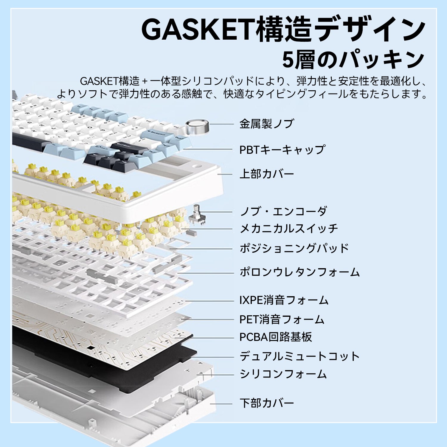 ・F75は2層のポロンフォーム、IXPEスイッチパッド、PETサウンドブーストパッド、底面のシリコンパッドを含む5層の吸音・防振内部設計を採用しています。この洗練された構造により、タイピングノイズと共振を大幅に低減し、ユーザーに静かで集中できるタイピング環境を提供します。 |