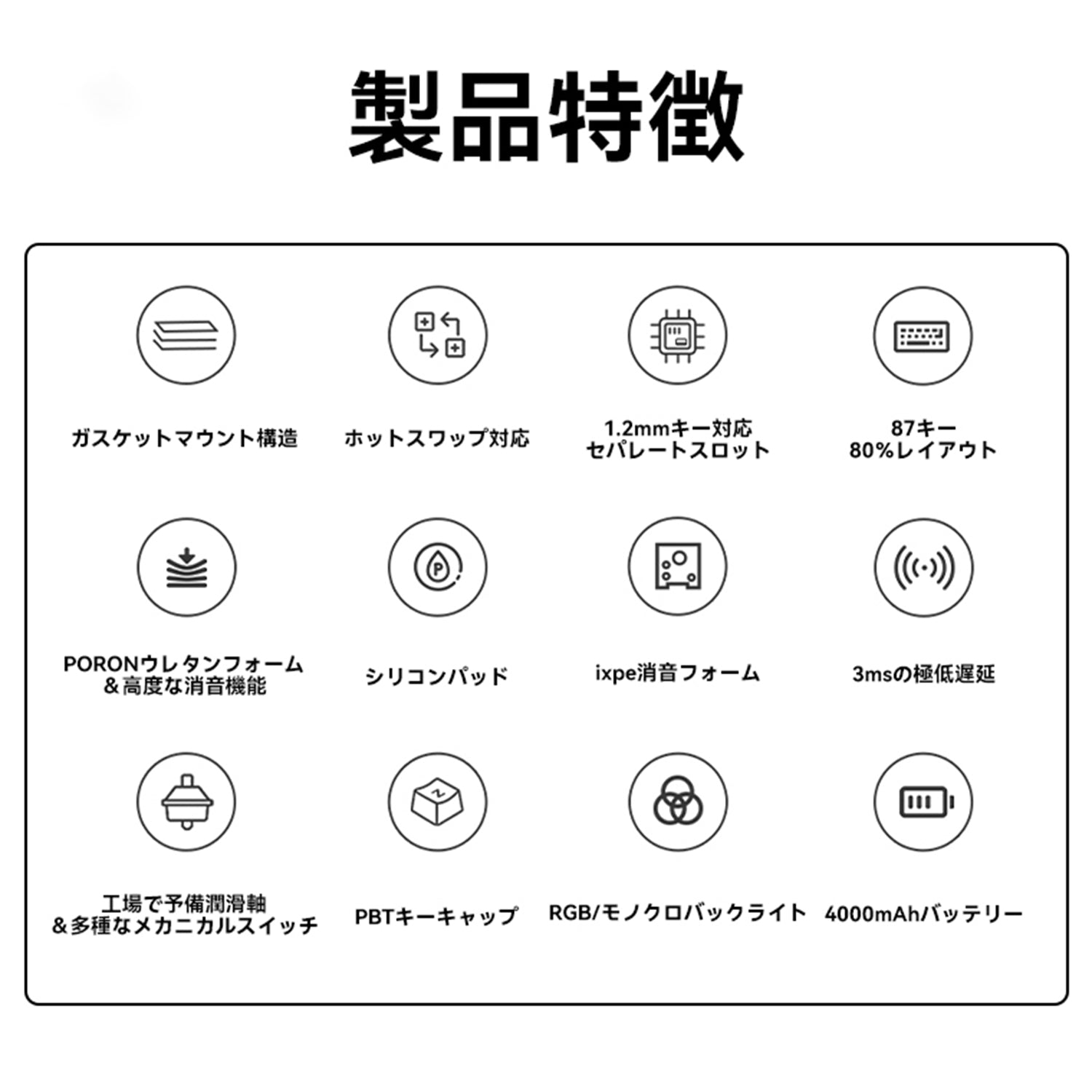 ・F87 Proは、Bluetooth、2.4GHzワイヤレス、Type-C USBの接続の3種類の接続方式を採用し、お客様のニーズにお応えします。3種類の接続方式により、F87 Proは3つのモードを簡単に切り替えることができ、効率的なマルチタスクとスピーディーなパフォーマンスを実現します。F87 Proには、長時間の使用に耐える最大10000mAhの大容量バッテリーが付属しています。 |