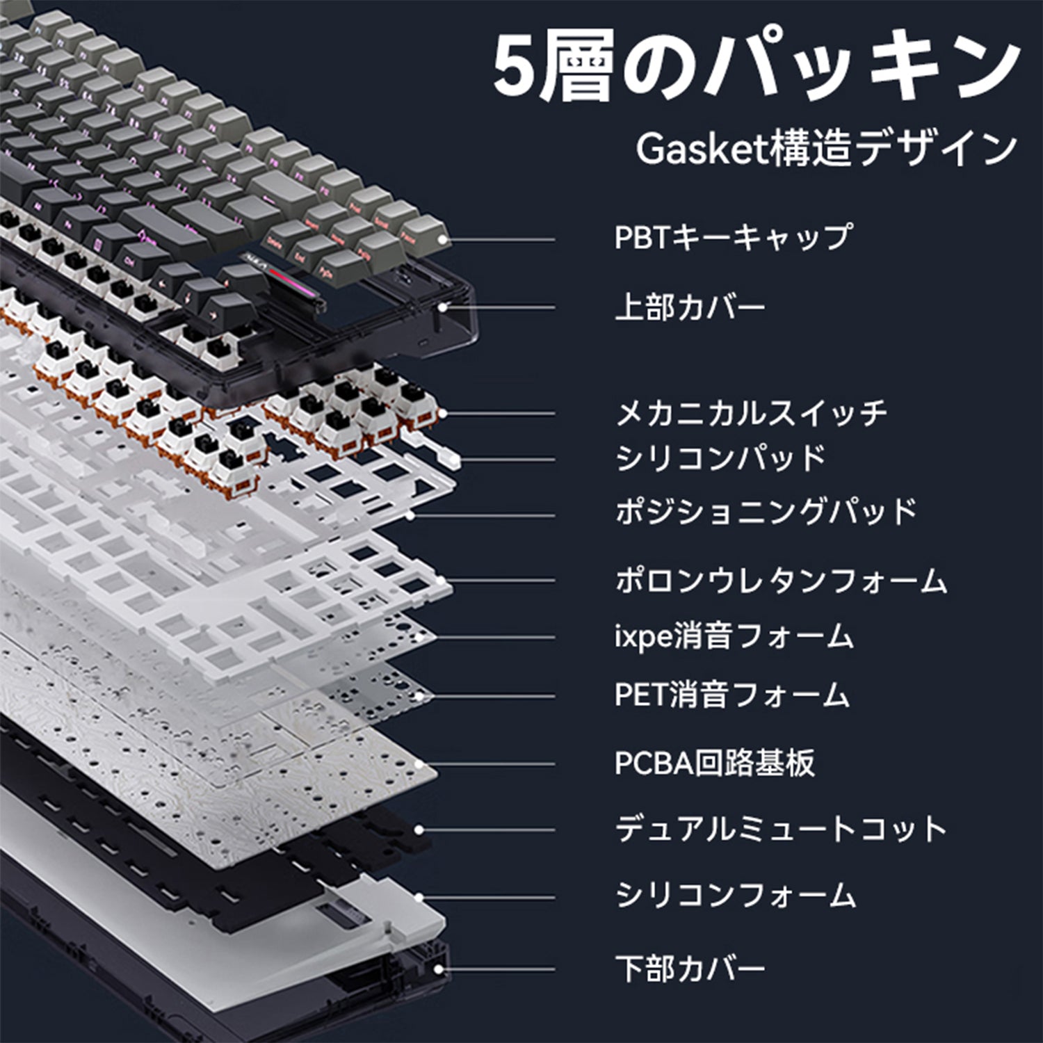 ・F87 Proは、IXPEアンダーシャフトパッドとポロンコットンを含む5層パッド構造で設計されております。この洗練された構造により、キーボードの音質が大幅に向上し、ユーザーに静かで集中できるタイピング環境を提供します。 |