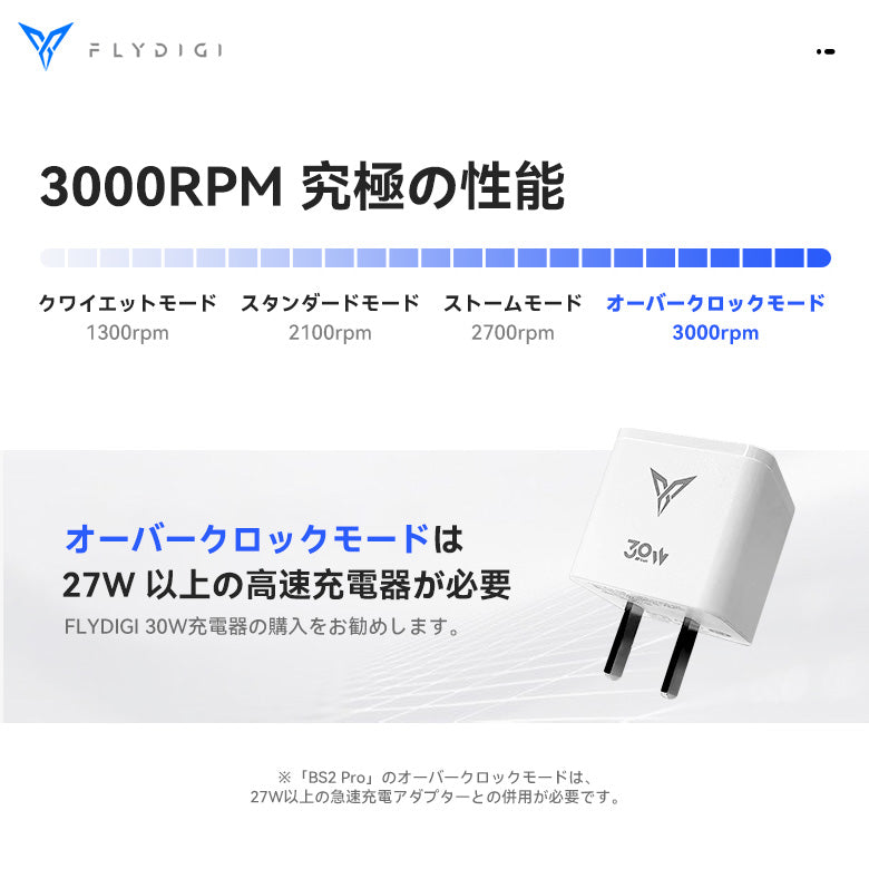 ・FLYDIGI BS2 冷却台は3000rpmオーバークロックモード、2700rpmストームモード、2100rpm標準モード、1300rpm静音モードがあります。 (オーバークロックモードには18W以上の高速充電器が必要です。) |