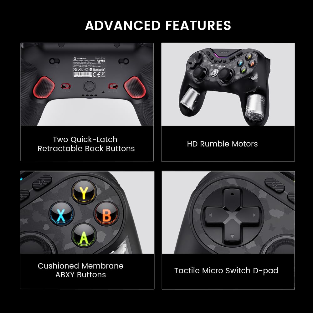 ・ GameSir Tarantula Pro コントローラーは9つの拡張キーを備え、キーの組み合わせだけで、目的のキーを即座にリマップでき、より多くの戦略を簡単にプログラムできる。また2種類のトリガーを備え、ホール効果トリガーとマイクロトリガーをシームレスに切り替えます。どんなゲームでも応答性を高めるために、素早く切り替えて正確なコントロールをお楽しみください。 |