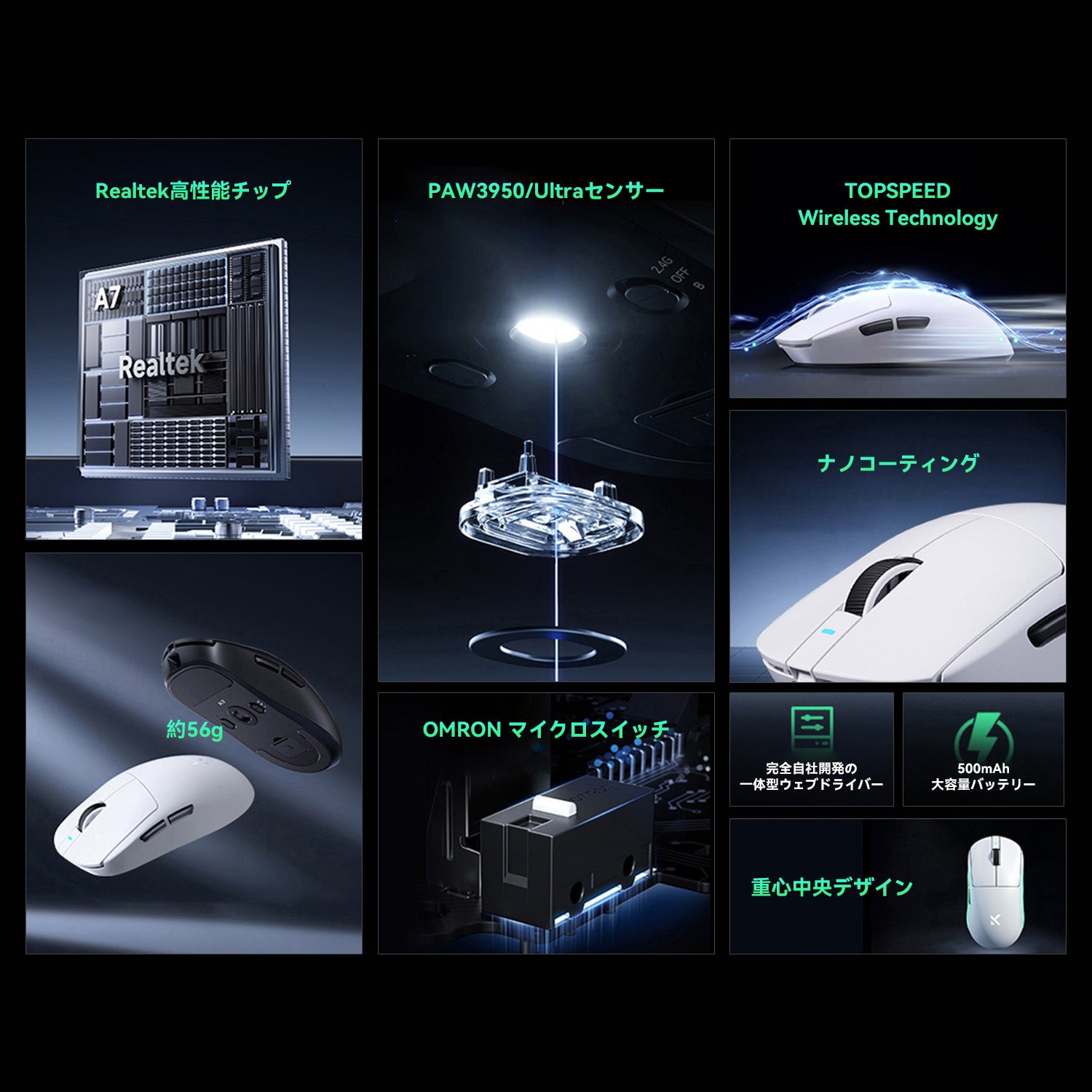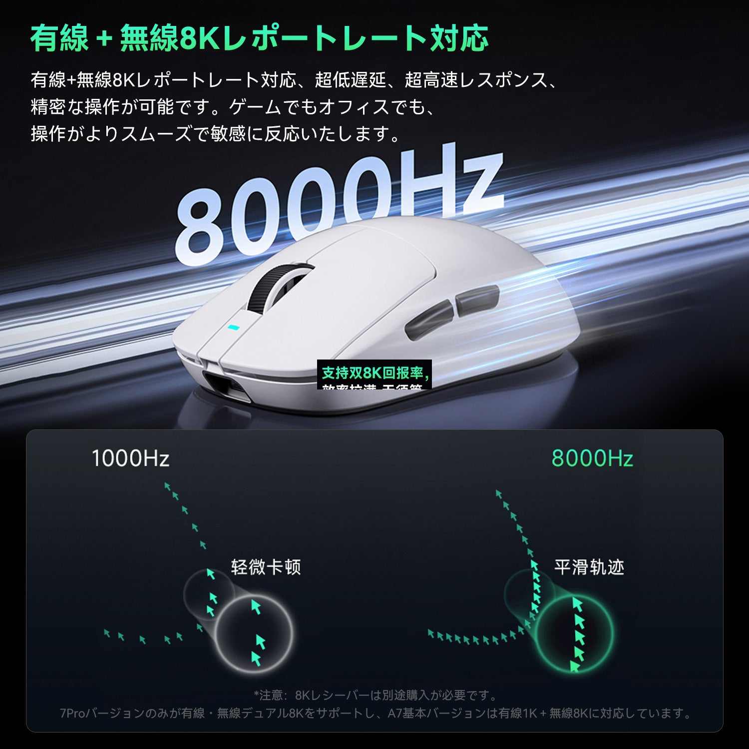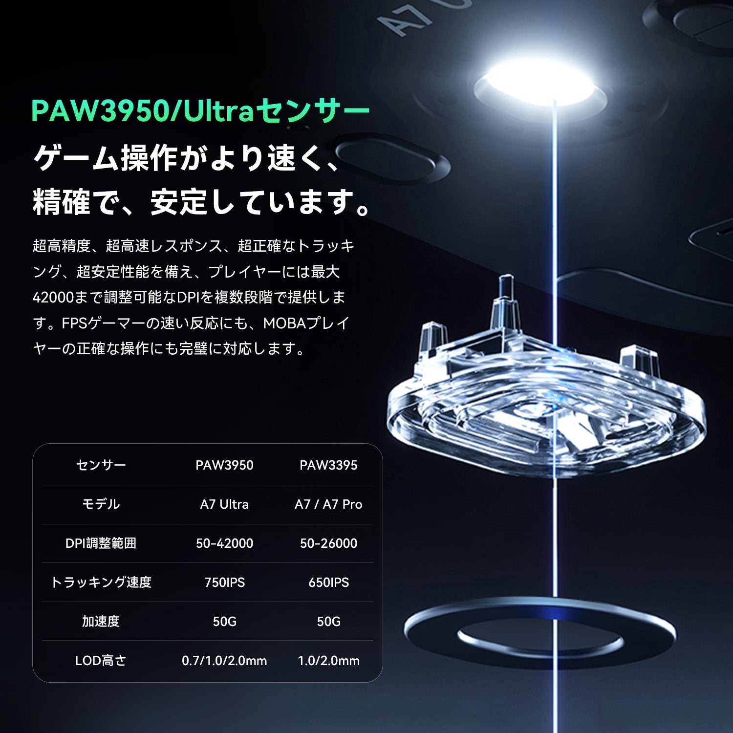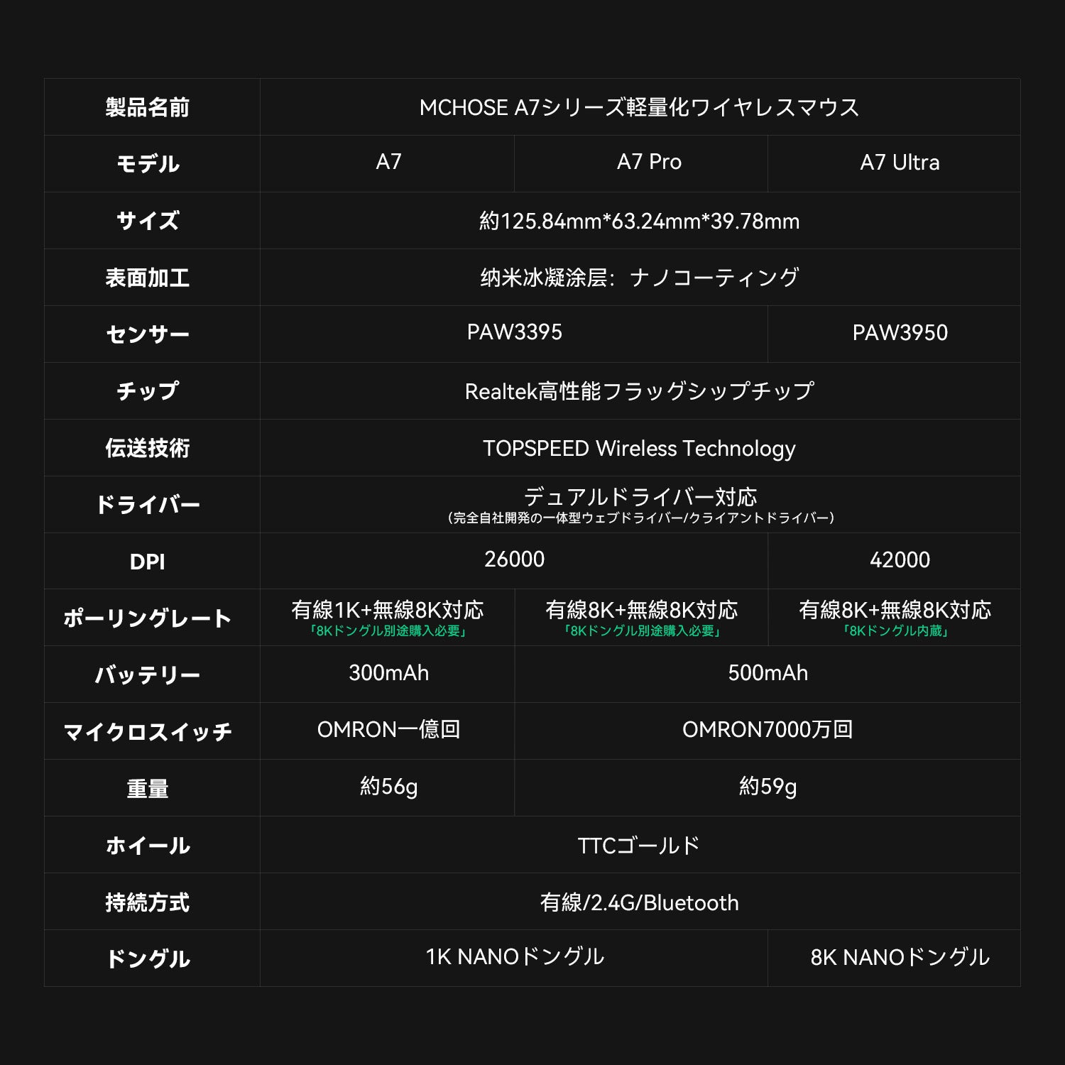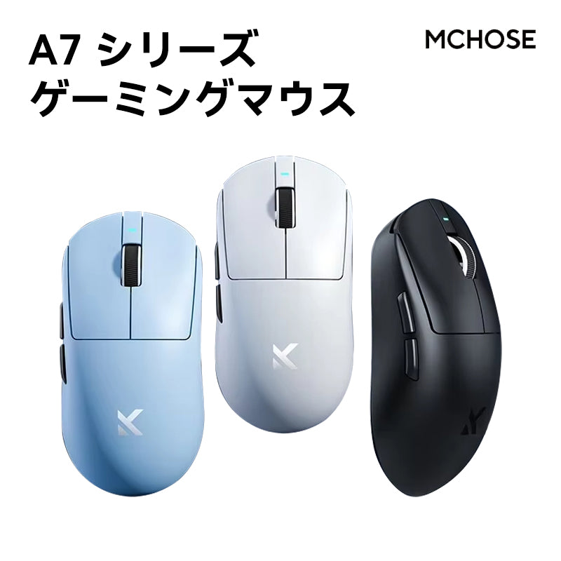 MCHOSE A7 / A7 Pro / A7 Ultra ゲーミングマウス ワイヤレス 1k/8Kドングル付き 無線 超軽量 約56グラム PAW3395/PAW 3950 26000DPI/42000 Bluetooth/2.4Ghz/USB-C接続 バッテリー最大500mAh 4色選択可能 中型手 大型手 オフィス ゲーム PCアクセサリ