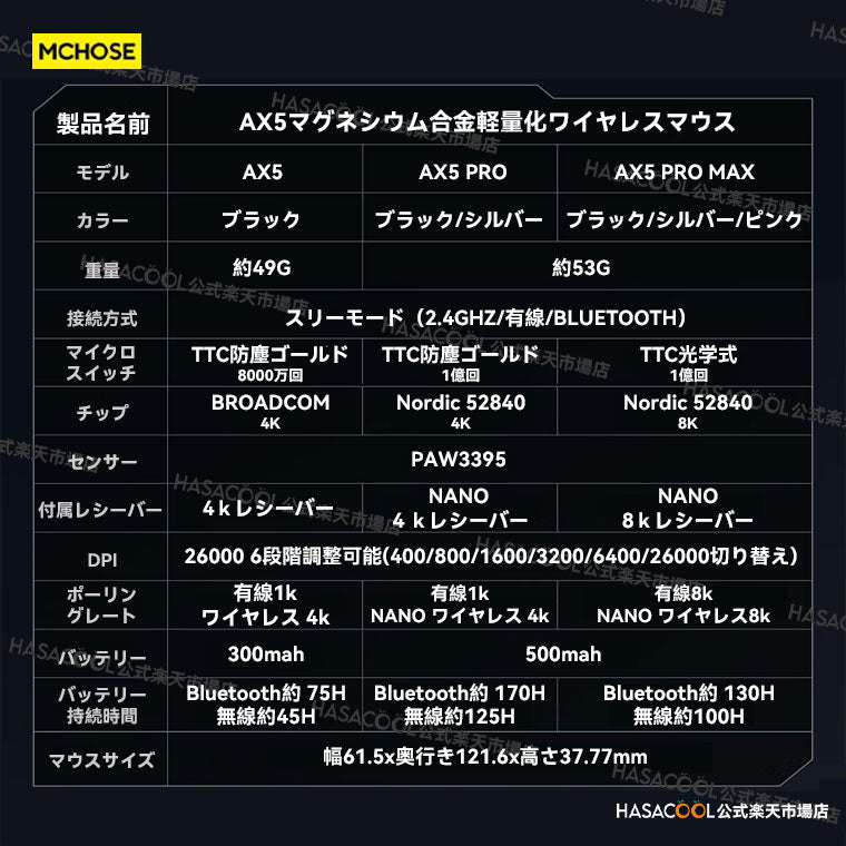 Mchose AX5 / AX5 Pro / AX5 Pro Max マグネシウム合金ゲーミングマウス ワイヤレス 無線 軽量化 PAW3395 Nordic52840 スリーモード接続 2.4Ghz/USB-C接続 バッテリー最大125時間持続 4k/8kドングル付属 多色選択可能