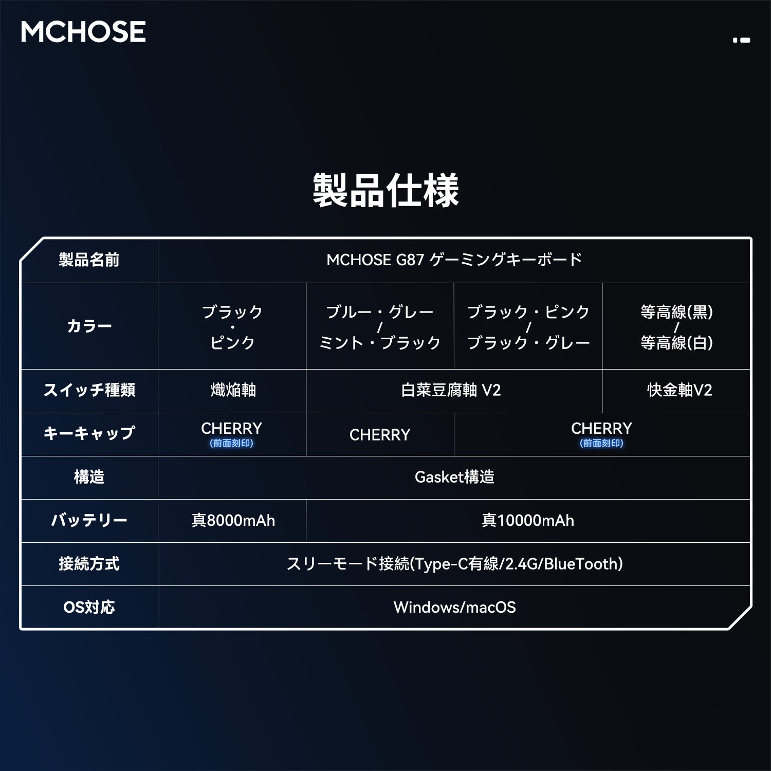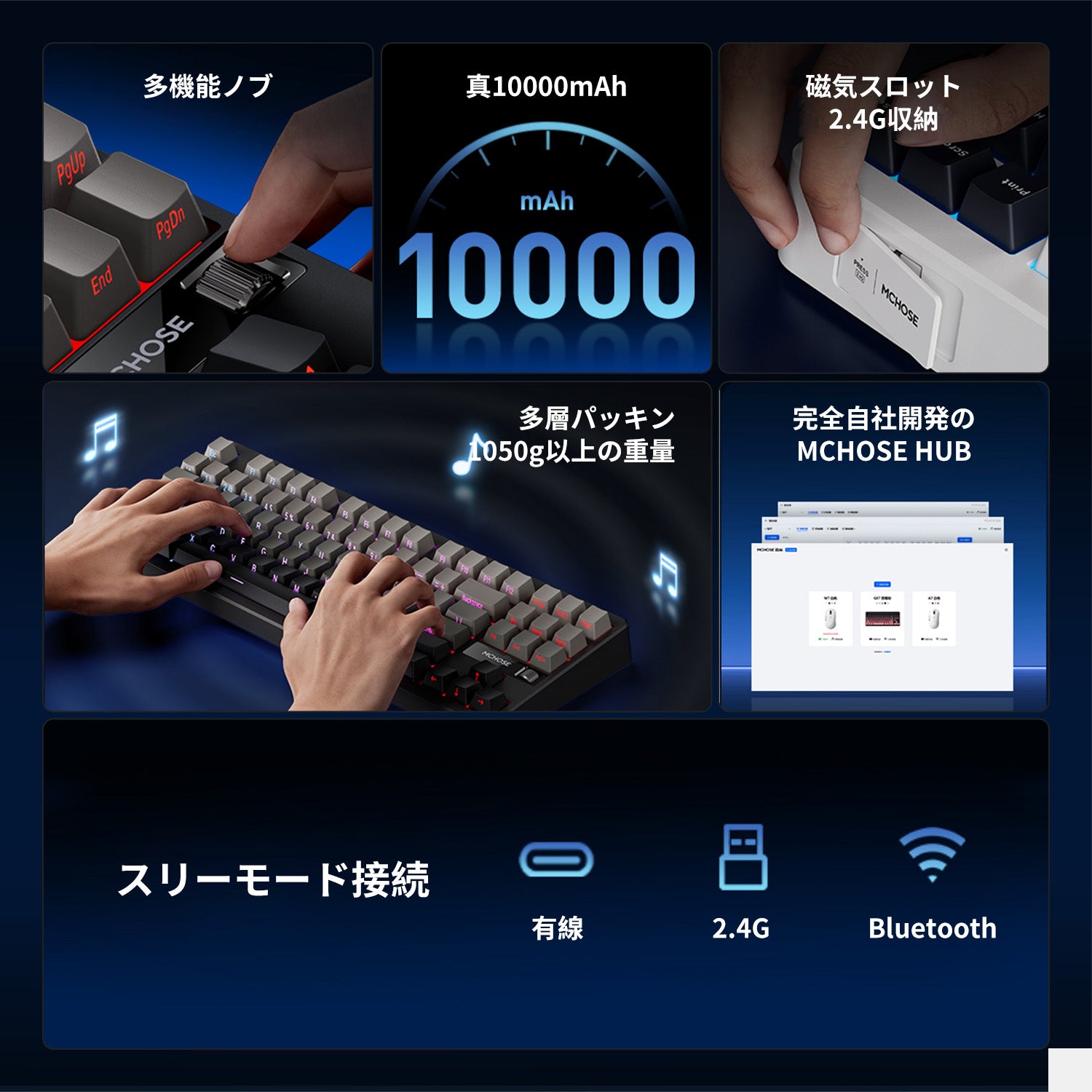 MCHOSE G87 ゲーミングキーボード メカニカルキーボード 80%レイアウト 87キー コンパクト Bluetooth5.0 / 2.4Ghz / Type-Cケーブル ホットスワップ プディングキーキャップ RGBバックライト 琉光アイスクリーム軸 氷軸 風信子軸 ( ヒヤシンス軸 ) 10000mAh バッテリー