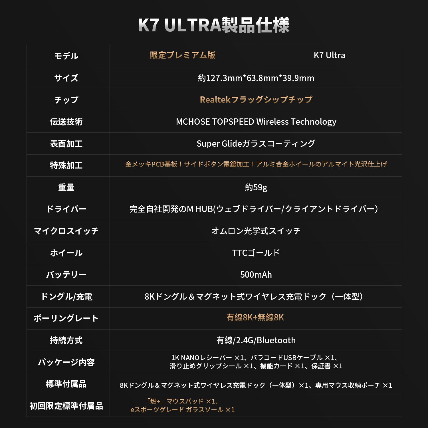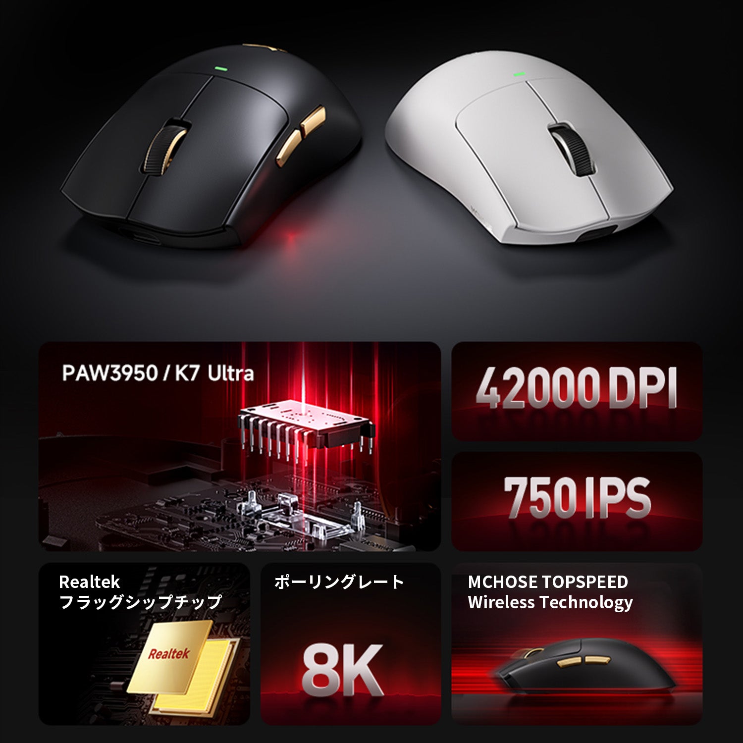 MCHOSE K7 Ultra ゲーミングマウス ワイヤレス 8Kドングル付き 充電ドック付き 超軽量 59グラム PAW3950 Realtek BlueTooth5.0/2.4Ghz/USB-C接続 バッテリー500mAh 2色選択可能 8KHz対応可