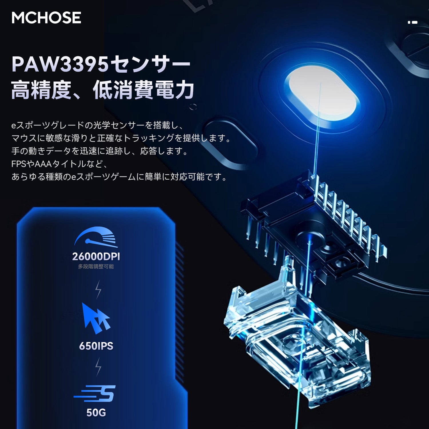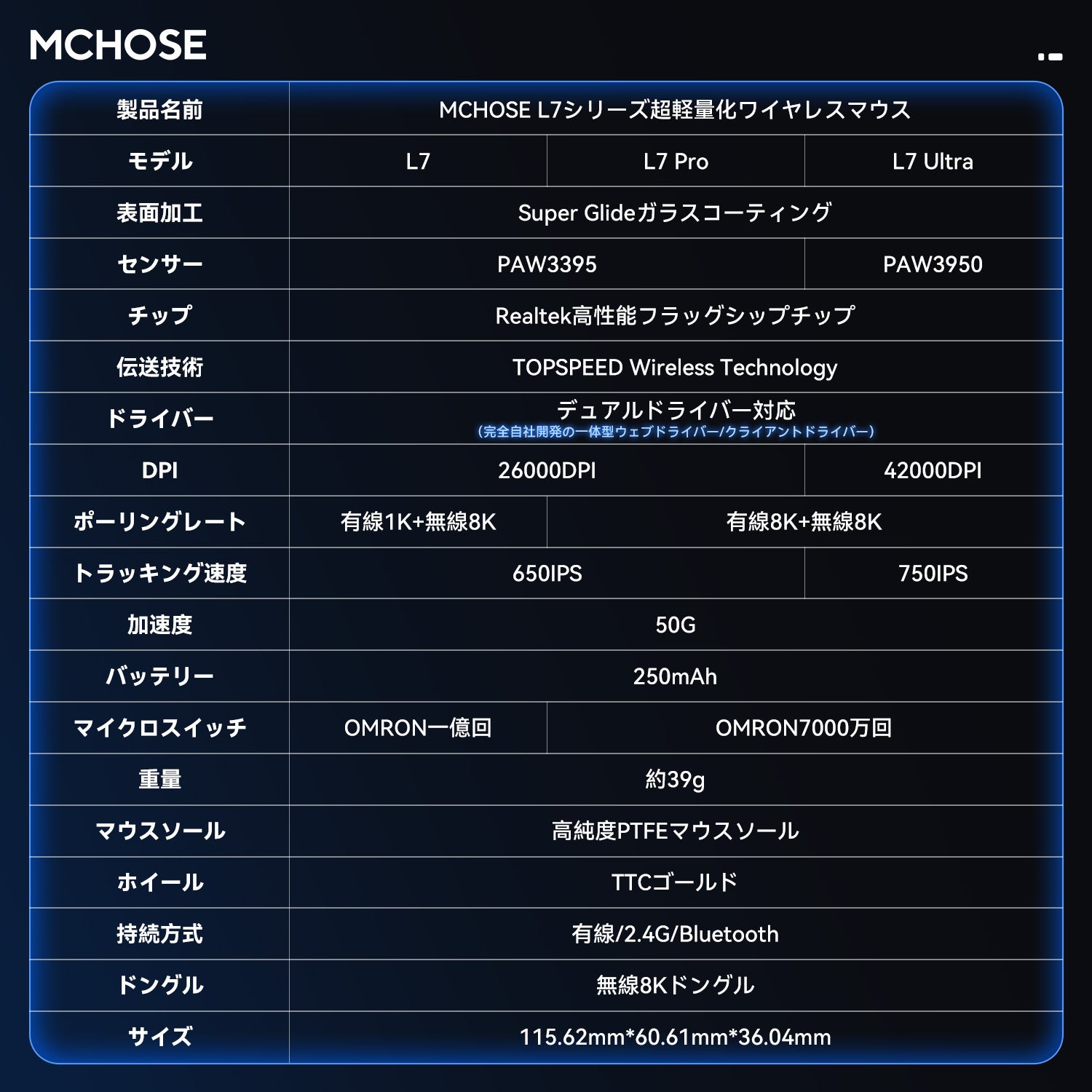 MCHOSE L7 / L7Pro / L7Ulra ゲーミングマウス ワイヤレス 1k/8Kドングル付き 無線 超軽量 約39グラム PAW3395 / PAW 3950 26000DPI/42000 Bluetooth/2.4Ghz/USB-C接続 バッテリー250mAh 3色選択可能 オフィス ゲーム PCアクセサリ