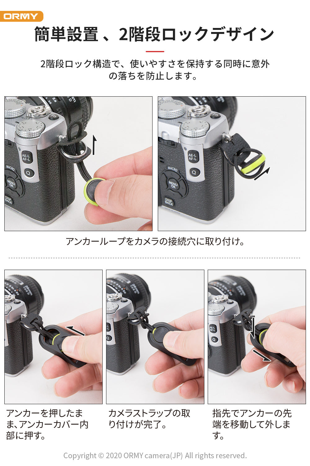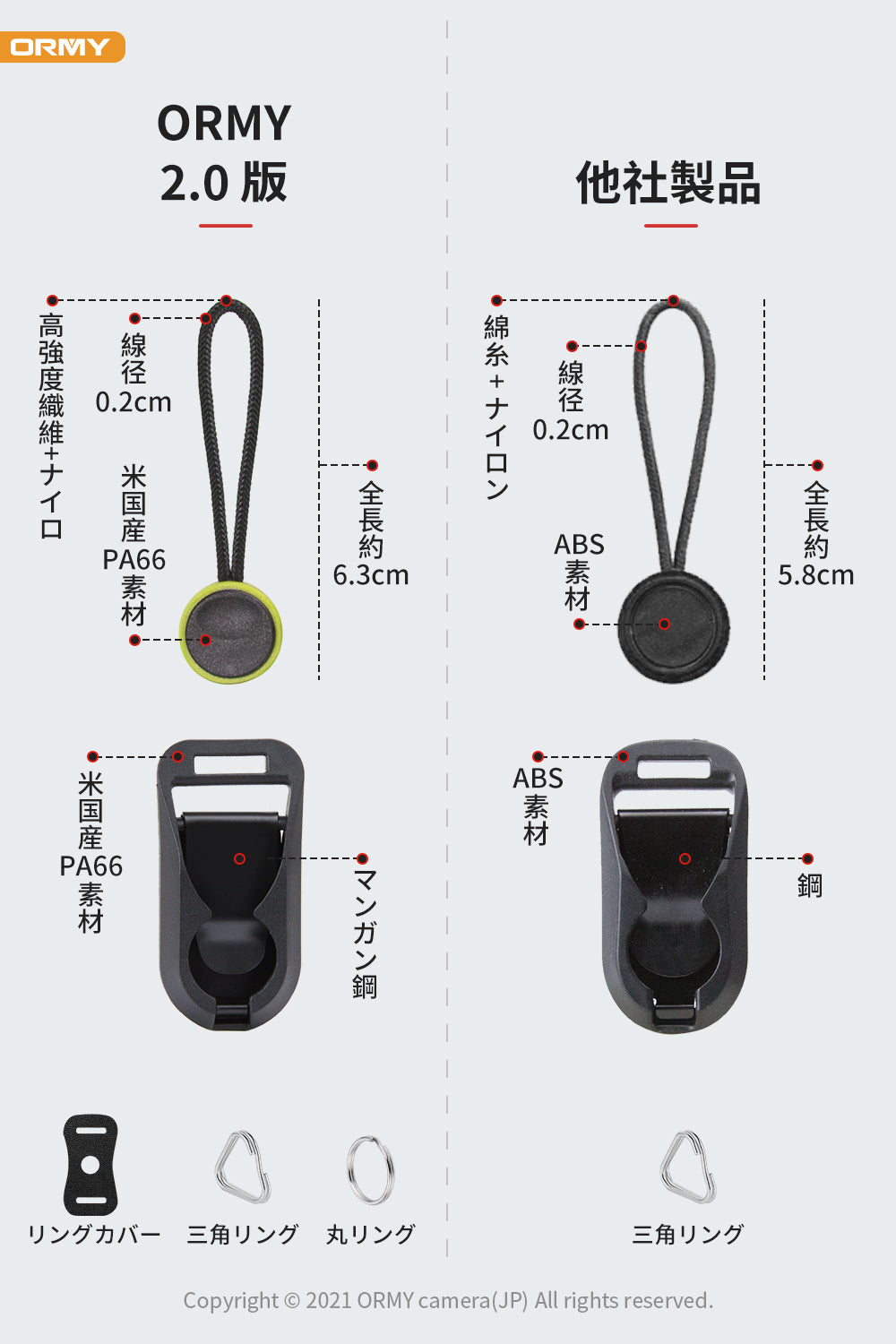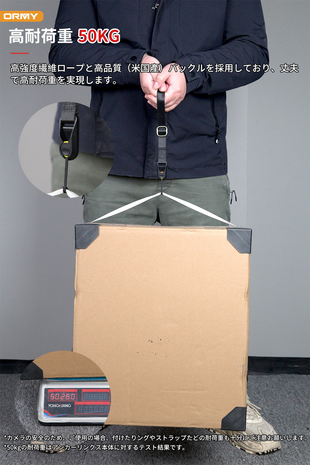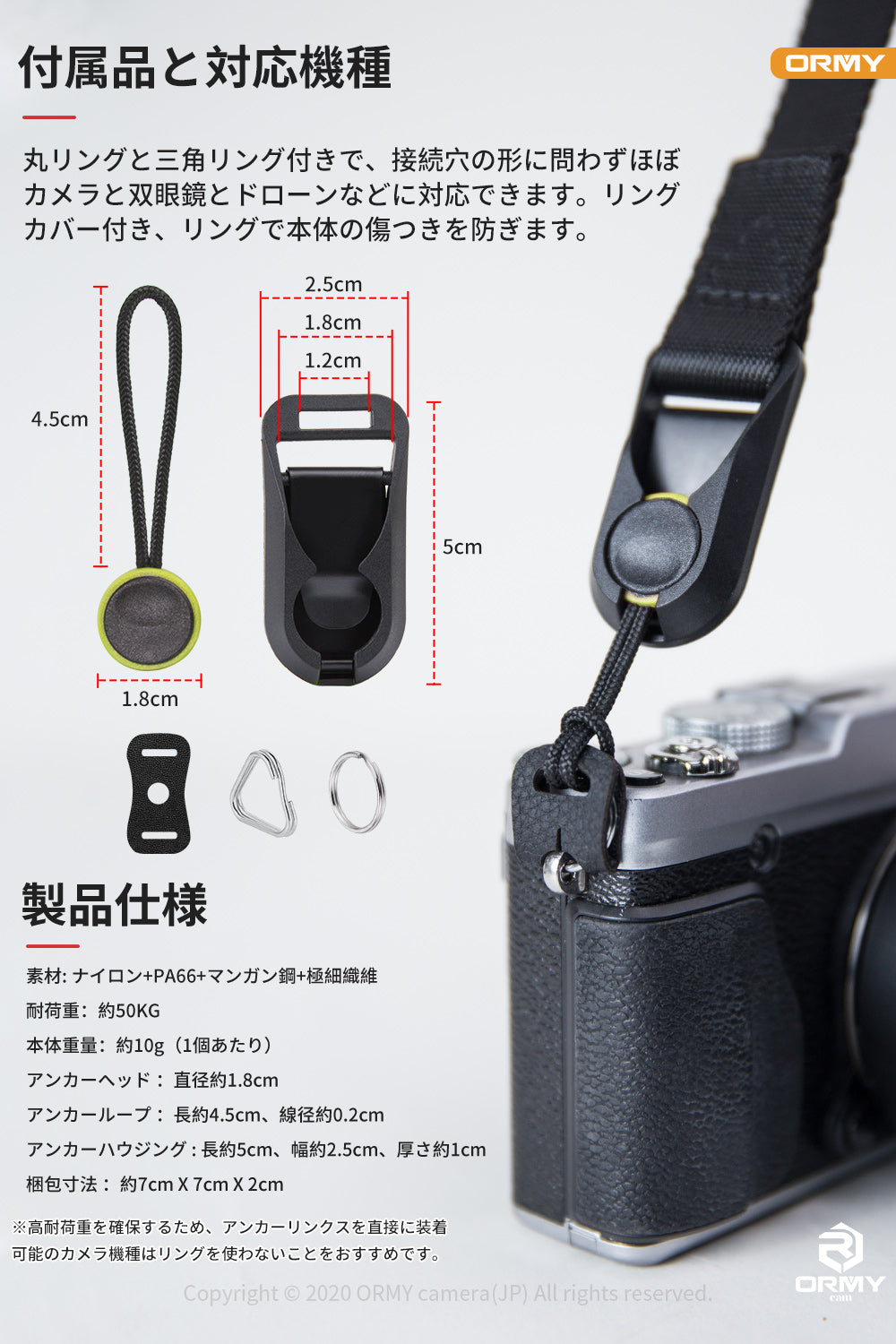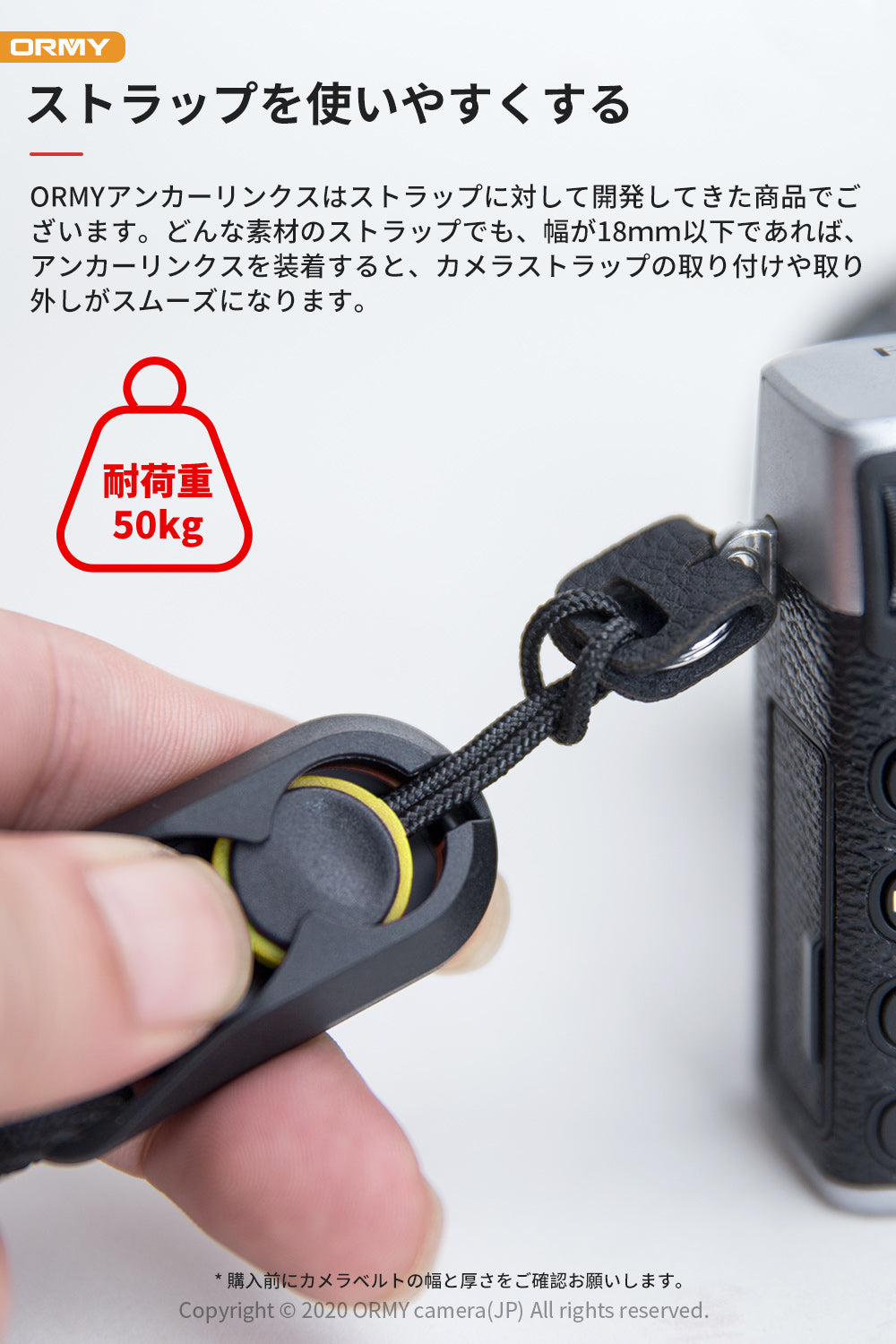 ・50KG以上の耐荷重はアンカーリンクス本体に対するテスト結果です。カメラの安全のため、ご使用の場合、付けたリングやストラップなどの耐荷重も十分にご注意お願いします、アンカーリンクスを直接に装着可能のカメラ機種はリングを使わないことをおすすめです ※ORMYは日本登録商標でございます、登録番号: 第6108004号。模倣品を使う場合、カメラが以外落下のリスクがありますので、ご注意ください。 |
