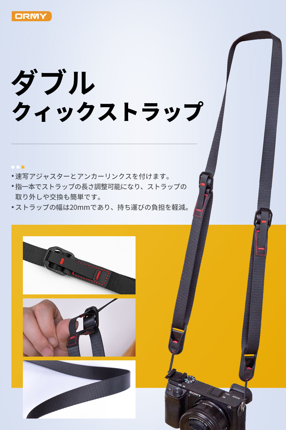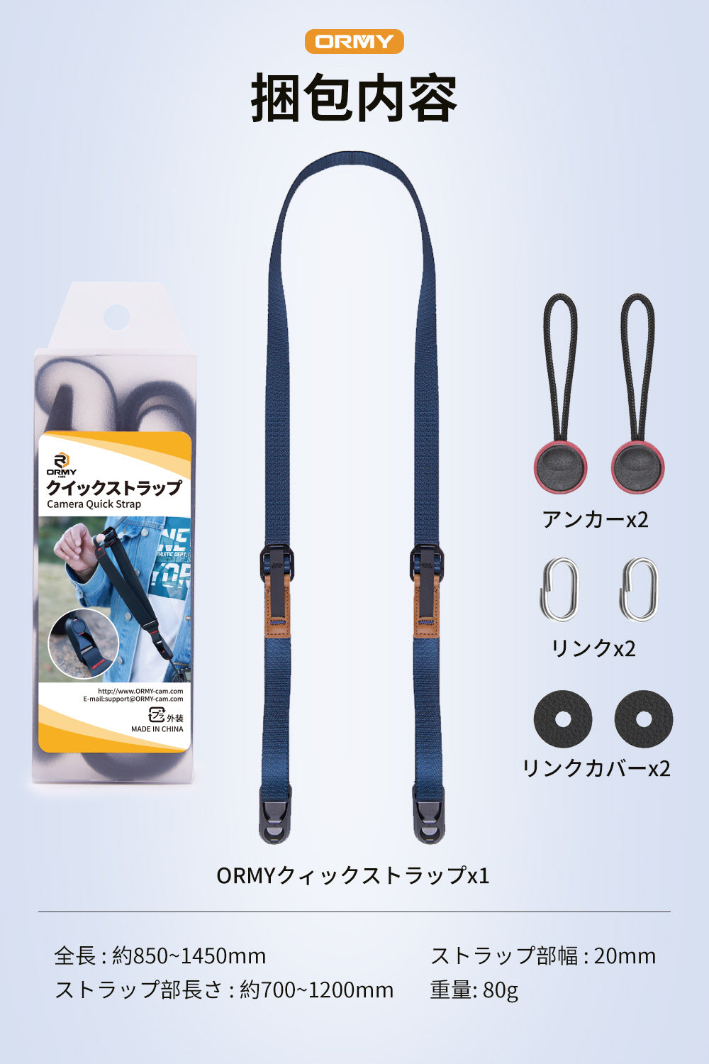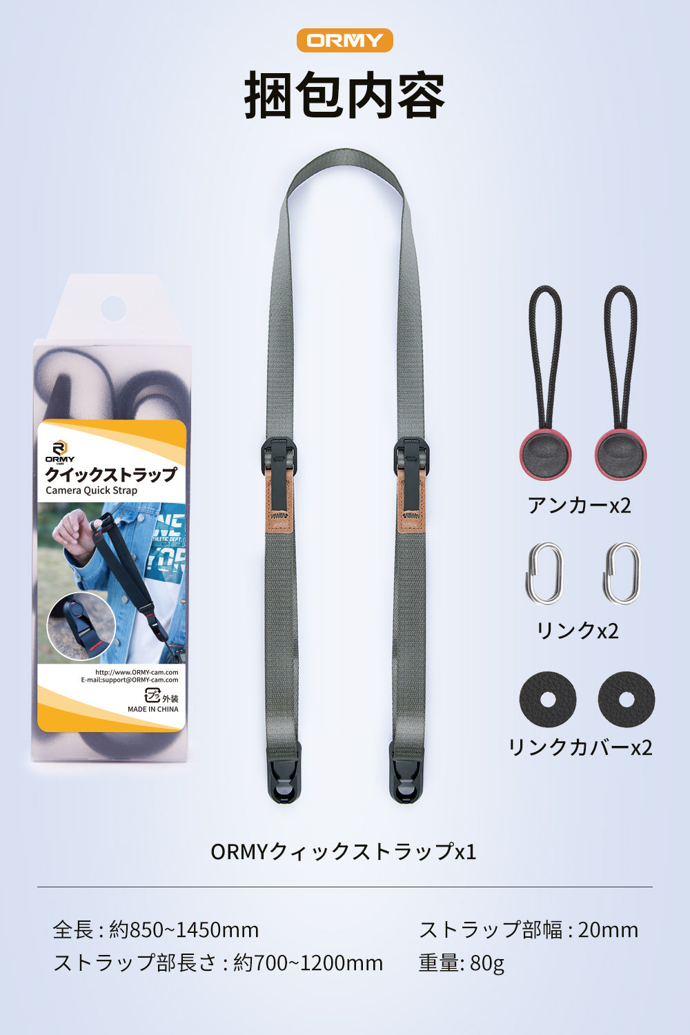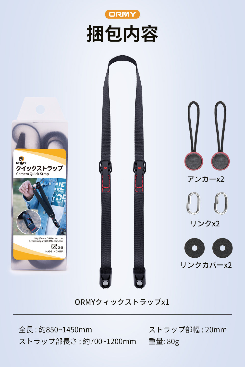 ・ストラップ部幅 : 2cm 全長 : 約85~145cm ストラップ部長さ : 約70~120cm 重量: 80g 付属品:ORMYクィックストラップx1 アンカーx2 リンクx2 リンクカバーx2 ※ORMYは日本登録商標でございます、登録番号: 第6108004号。模倣品を使う場合、カメラが以外落下のリスクがありますので、ご注意ください。 |