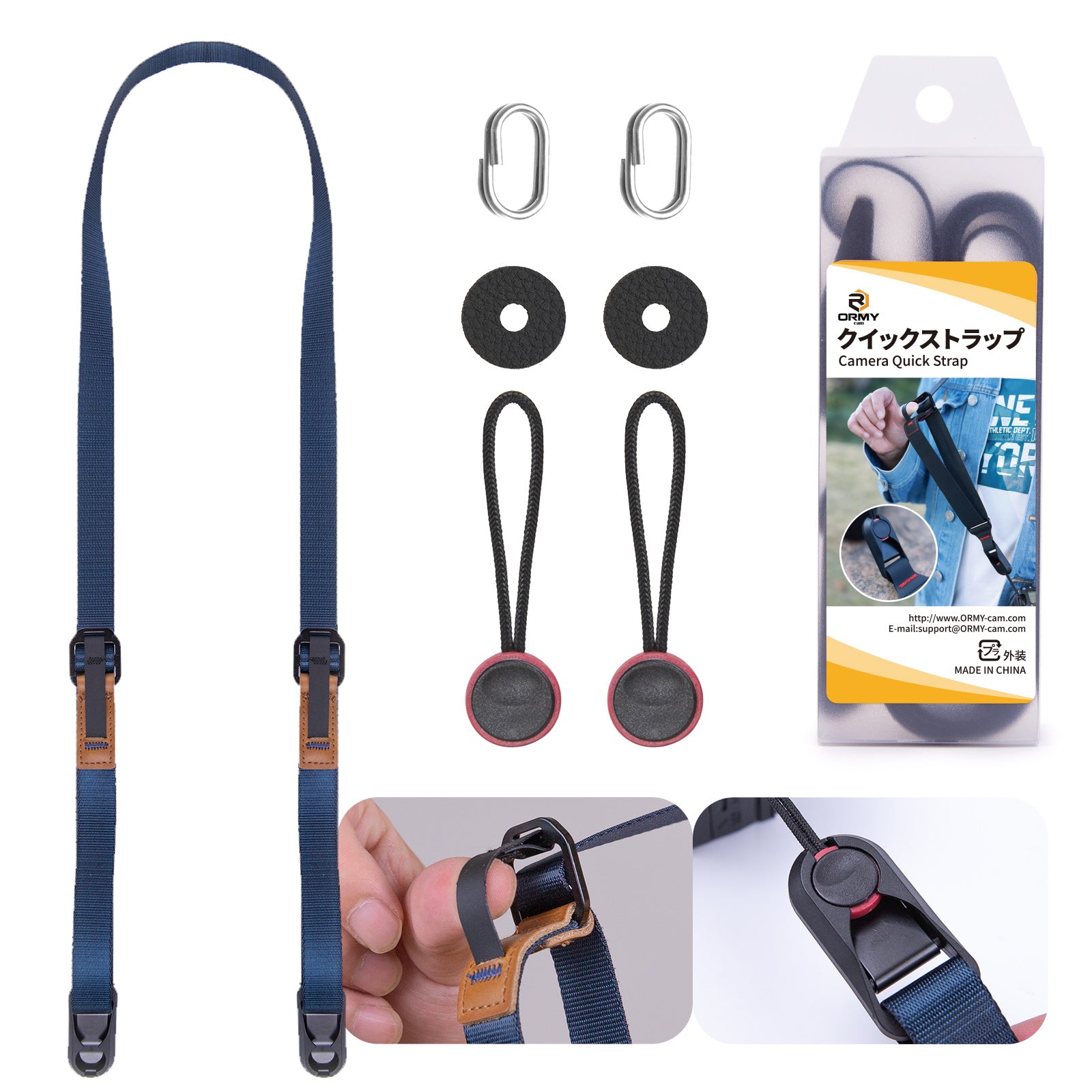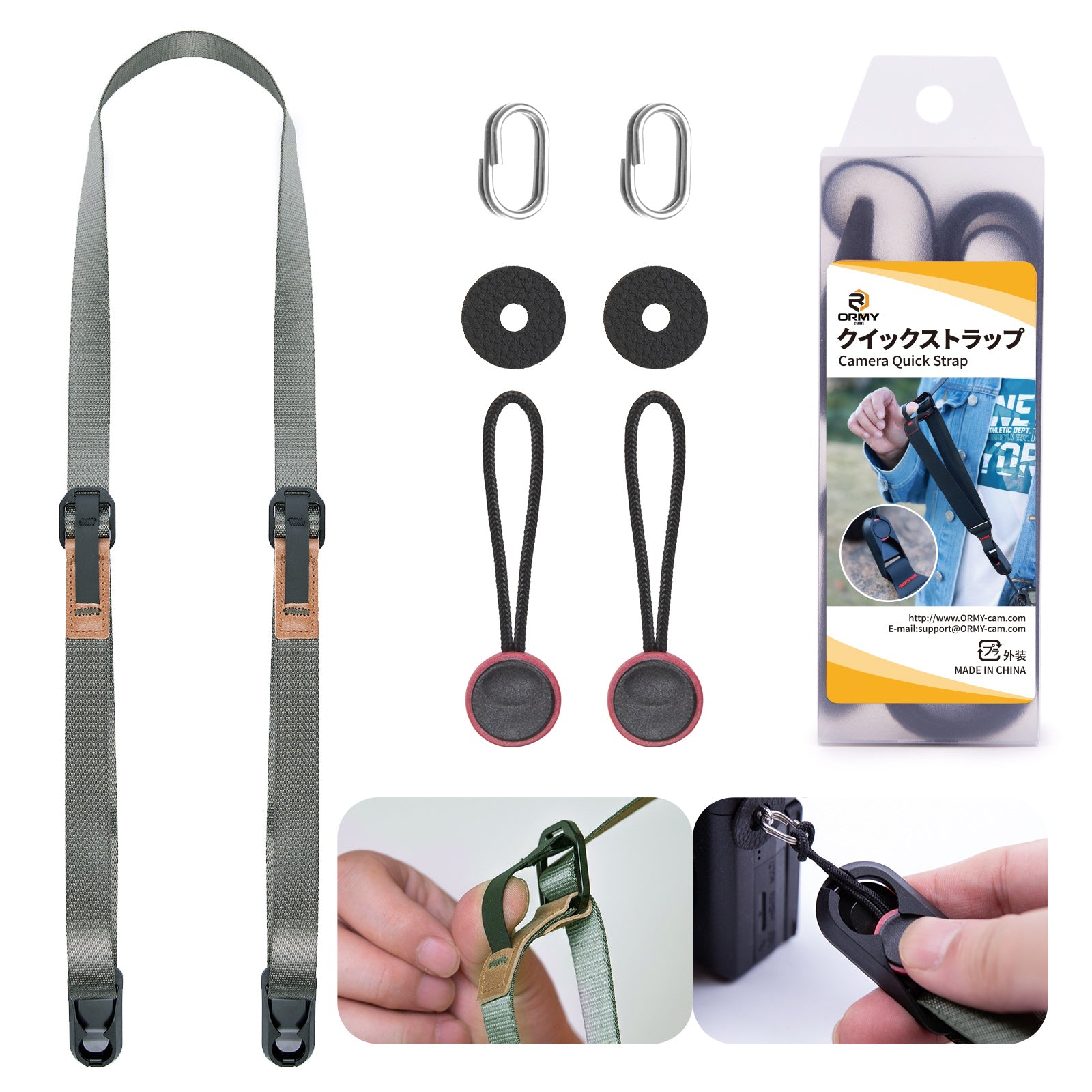 ・ ORMYクィックストラップは速写アジャスターとアンカーリンクスが付きます。速写アジャスターは指一本でストラップの長さ調整可能になります。移動時は締めて身体にフィット、瞬時に伸ばして撮影開始。アンカーリンクスはストラップの取り外しまた交換が簡単になります。ものすごく便利な商品です。 |