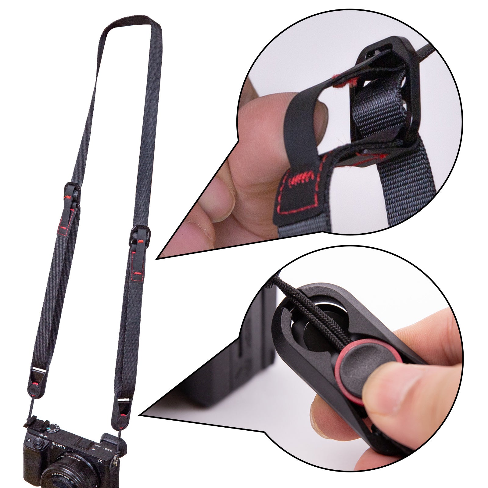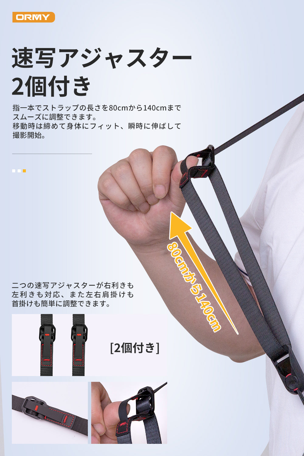 ・ストラップの幅は2cmです。エルゴノミクスデザイン基づき、カメラの重量を分散、持ち運びの負担を軽減します。長さは80cmから140cmまでスムーズに調整可能です。二つの速写アジャスターが付き、左右肩掛けも首掛けも簡単にストラップの長さを調整できます。簡単そうして便利です。 |