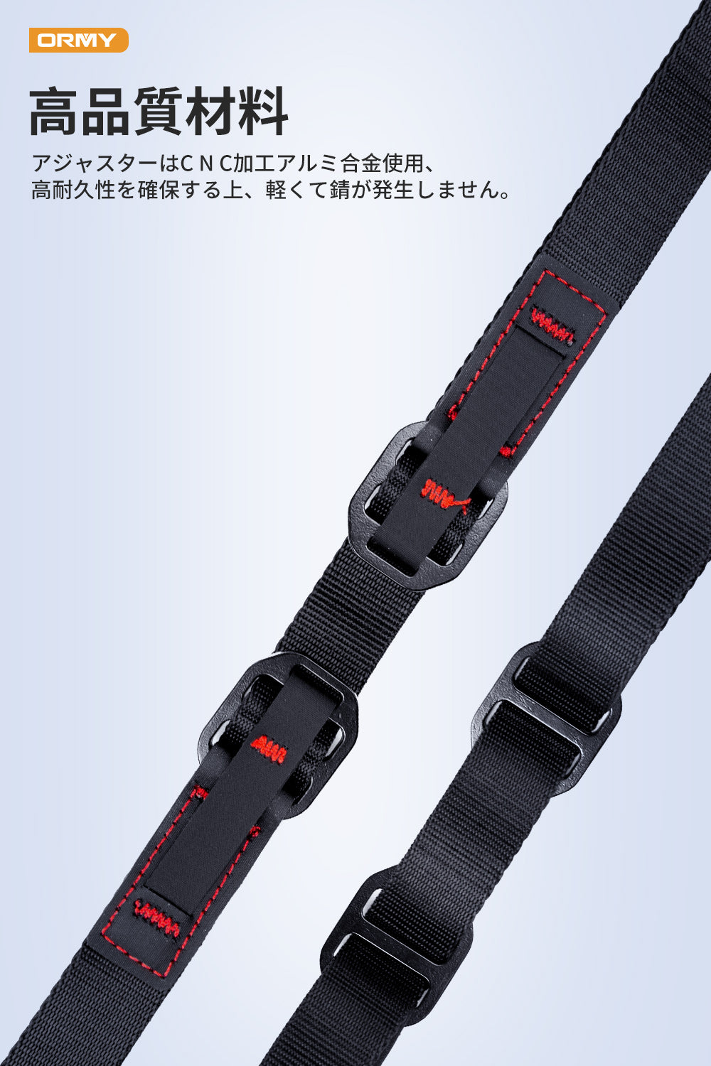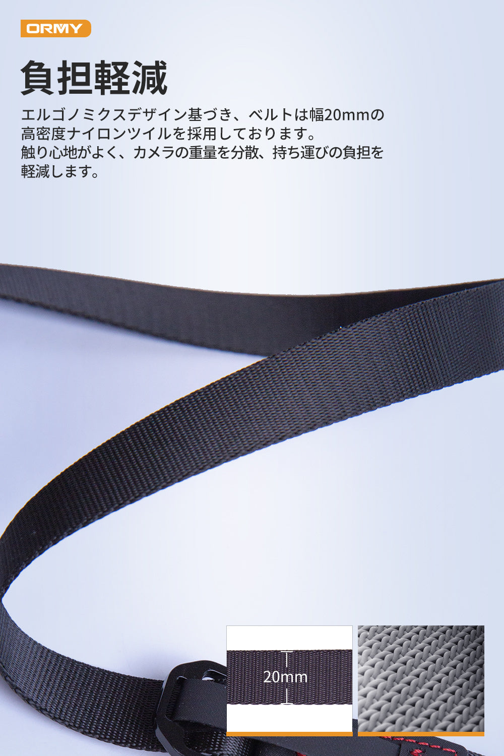 ・アジャスターはC N C加工アルミ合金を使用し、高耐久性を確保する上、軽くて錆が発生しません。ベルトは高密度ナイロンツイルを採用しており、触り心地がよく、メッシュ生地でカメラとレンズに傷を付きません。見た目もおしゃれです。 |