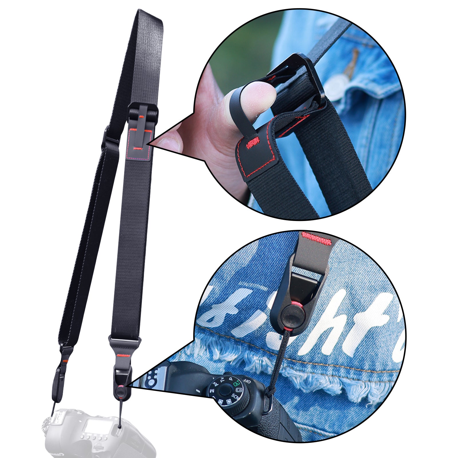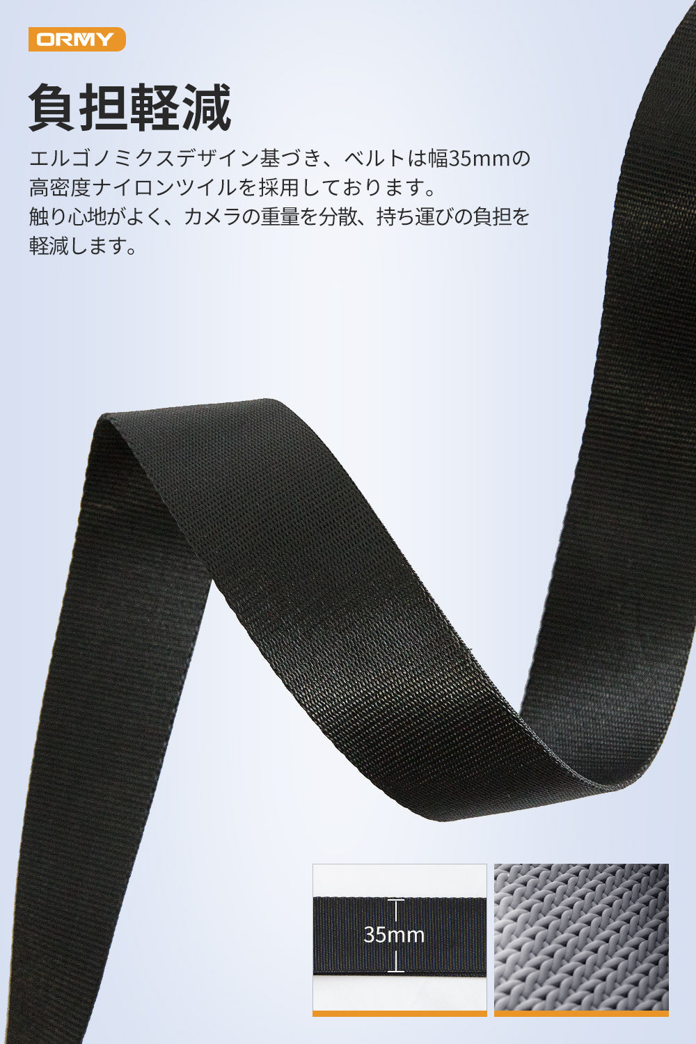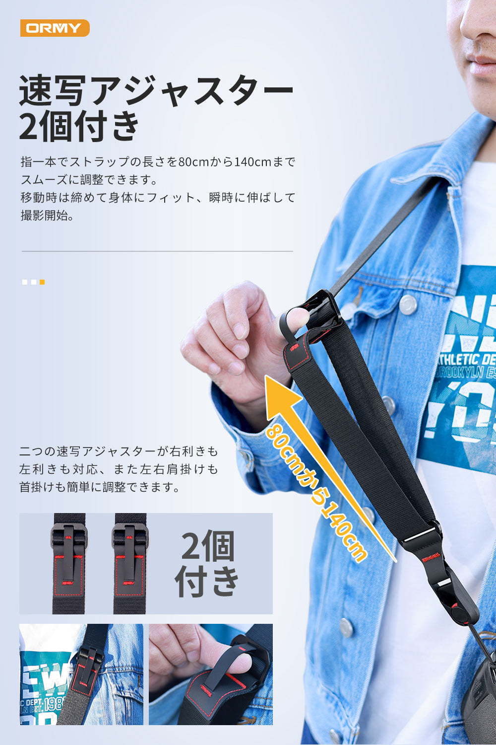 ・ ストラップの幅は3.5cmです。エルゴノミクスデザイン基づき、カメラの重量を分散、持ち運びの負担を軽減します。長さは80cmから140cmまでスムーズに調整可能です。二つの速写アジャスターが付き、左右肩掛けも首掛けも簡単にストラップの長さを調整できます。簡単そうして便利です。 |