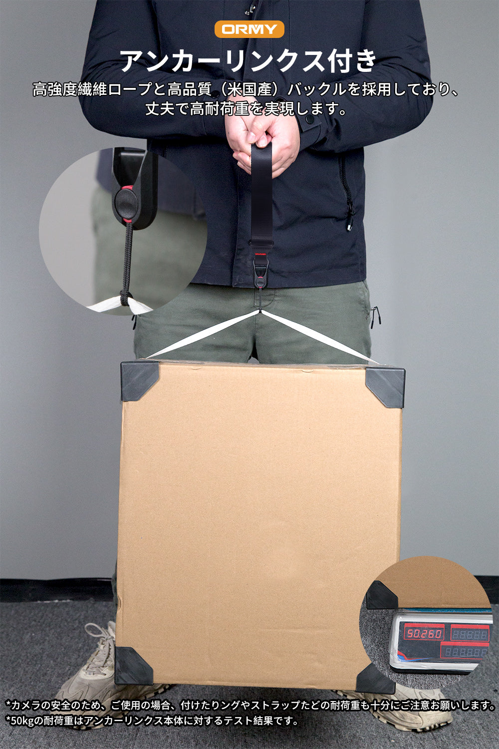 ・高人気の耐荷重強化アンカーリンクス付き、高強度繊維ロープと高品質ABS(米国産PA66)バックルを採用する上、特殊加工を実施し、実証より1個で50KG以上の耐荷重性を実現できます。2個を付ける場合、まさに100KG以上の耐荷重を実現できます。*50KG以上の耐荷重はアンカーリンクス本体に対するテスト結果です。カメラの安全のため、ご使用の場合、付けたリングやストラップなどの耐荷重も十分にご注意ください。 |