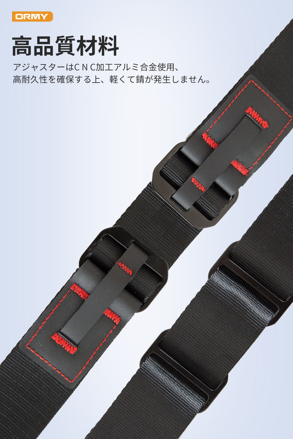 ・アジャスターはC N C加工アルミ合金を使用し、高耐久性を確保する上、軽くて錆が発生しません。ベルトは高密度ナイロンツイルを採用しており、触り心地がよく、メッシュ生地でカメラとレンズに傷を付きません。見た目もおしゃれです。 |