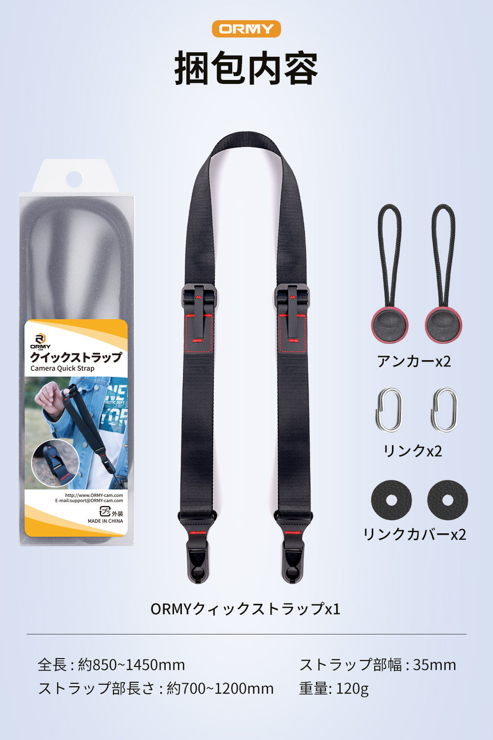 ・ストラップ部幅 : 3.5cm 全長 : 約85~145cm ストラップ部長さ : 約70~120cm 重量: 120g 付属品:ORMYクィックストラップx1 アンカーx2 リンクx2 リンクカバーx2 ※ORMYは日本登録商標でございます、登録番号: 第6108004号。模倣品を使う場合、カメラが以外落下のリスクがありますので、ご注意ください。 |