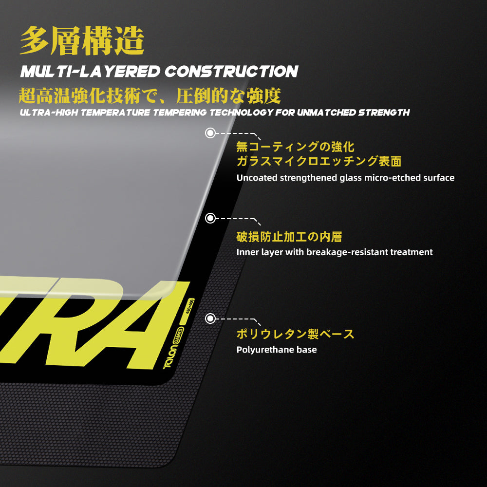 ・ 約620℃以上の高温で熱処理された特殊強化ガラスを採用し、摩耗や劣化に圧倒的な強さを発揮します。従来の布製マウスパッドでは得られない優れた耐久性を実現。さらに無コーティング設計により、長期間使用しても性能低下を最小限に抑え、常に安定した操作感を維持します。 |