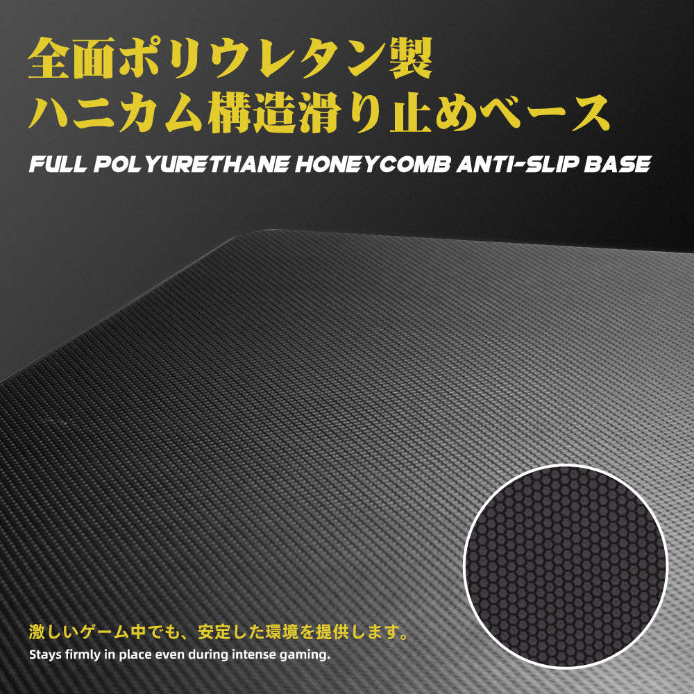 ・裏面には全体を覆うポリウレタン製ハニカム(蜂の巣状)ベースを採用します。デスクにしっかり固定され、激しい操作でもずれることがありません。さらに防水と防汚仕様で、汗や水滴を簡単に拭き取ることができ、清潔に保てます。 |