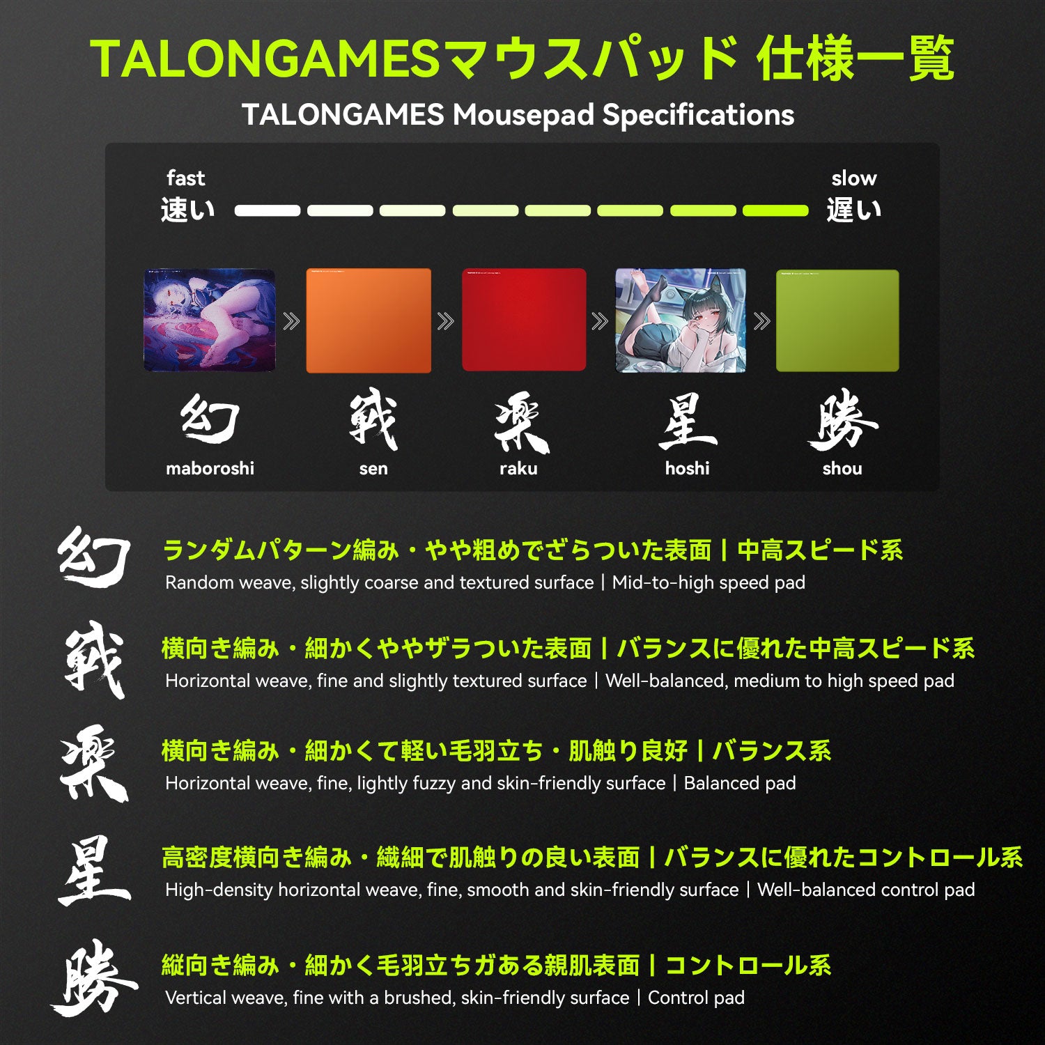 ・TALONGAMES はeSports製品の設計・製造を専門とするブランドで、日本の大学生 eSports大会に勧められ、製品は世界中の多くの国で販売され、世界中のゲーマーから支持されています。 「戦」シリーズのマウスパッドはゲーマーのために特別に開発された、高品質で高コスパに優れた新世代のプロフェッショナルゲーミングマウスパッドで、とてもお勧めです! |