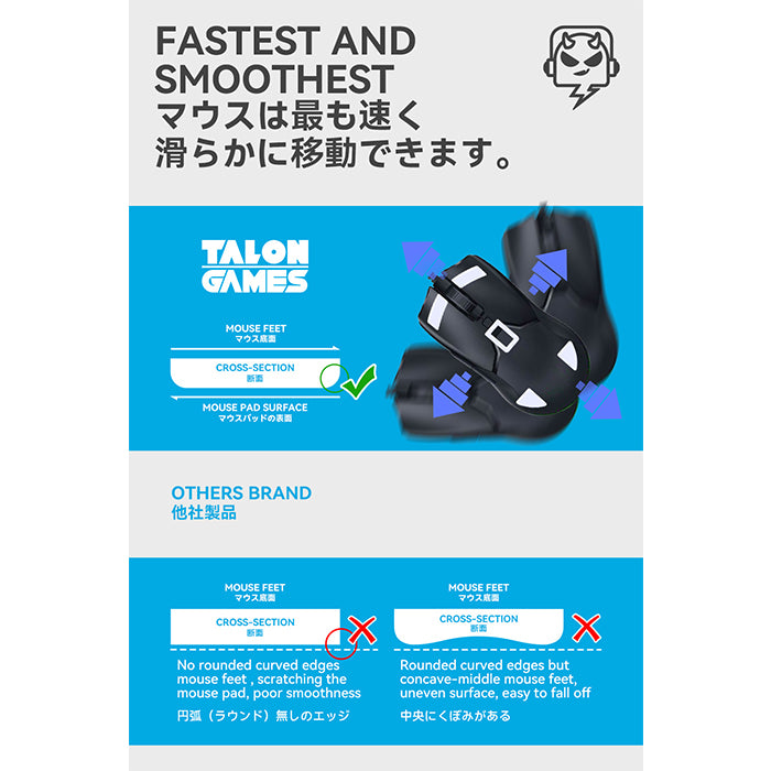 超スムーズ ・純テフロン(フッ素樹脂)の材料とTALONGAMESオリジナルの滑り強化材料を使用し、マウスの安定感とコントロール精度を向上させ、マウスの移動を改善します。