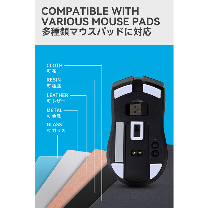 ラウンドエッジ加工 ・独自なラウンドエッジデザインで、柔らかい布製マウスパッドでもソールの引っ掛かりがなく快適にお使い頂けます。各種類表面のマウスパッドに対応し、より快適、精度が高いマウス操作を実現します。
