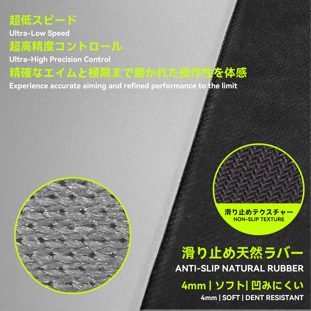 ・裏面は厚さ4mmの天然ゴムで作られ、硬すぎず沈み込みすぎないちょうどよい柔らかさで最大の安定性を提供します。プレイヤーは使用中にマウスパッドがずれて操作に影響を与えることを心配する必要はありません。 eSports仕様の安定性のパフォーマンスを実現します。 |