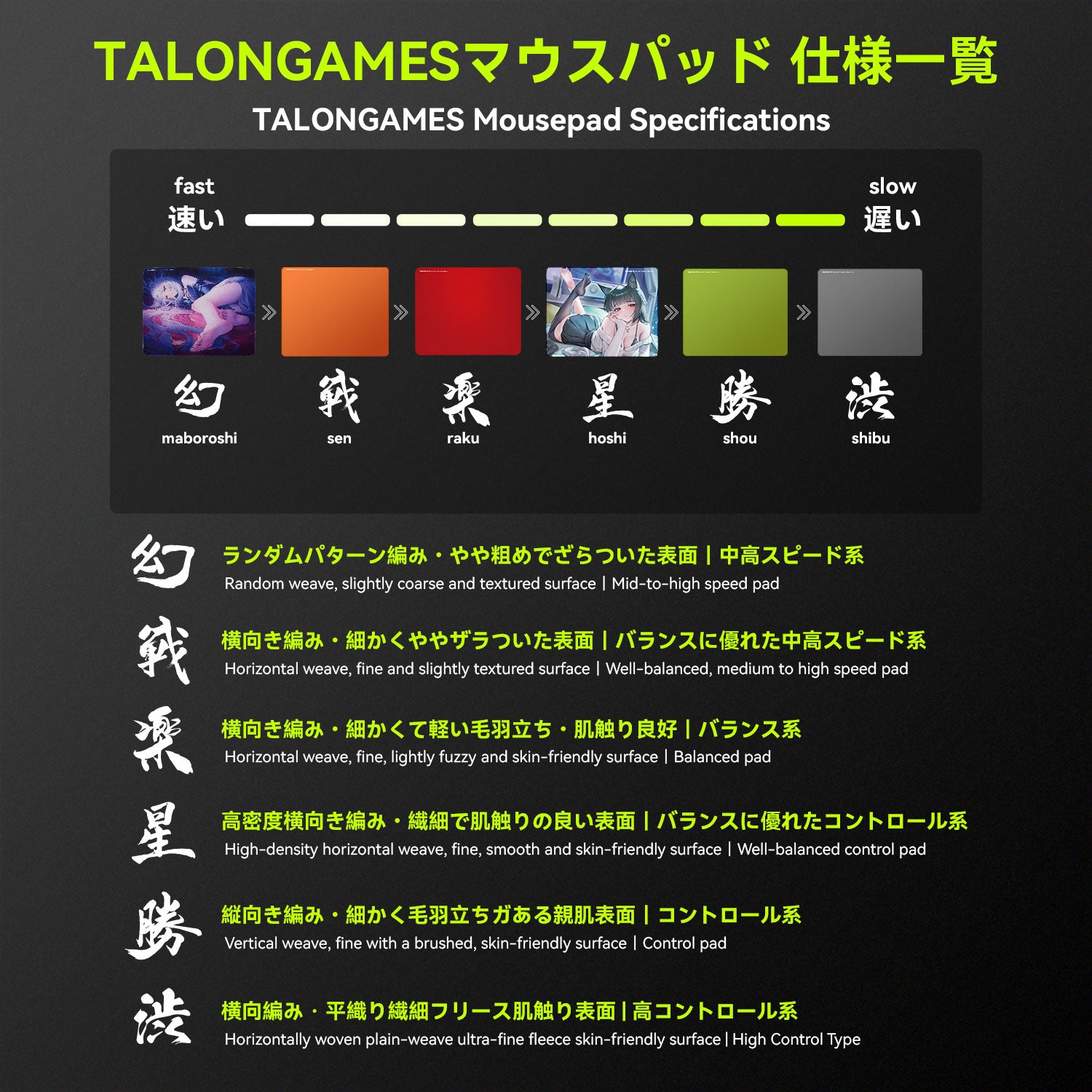 ・TALONGAMES はeSports製品の設計・製造を専門とするブランドで、日本の大学生 eSports大会に勧められ、製品は世界中の多くの国で販売され、世界中のゲーマーから支持されています。 「渋」シリーズのマウスパッドはゲーマーのために特別に開発された、高品質で高コスパに優れた新世代のプロフェッショナルゲーミングマウスパッドで、とてもお勧めです! |